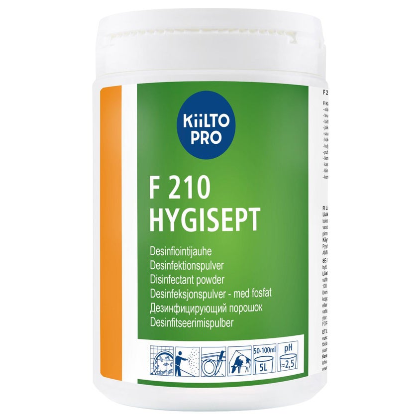 Ytdesinfektion F210 Hygisept är ett kaliumpersulfathaltigt desinfektionsmedel i pulverform. Används för desinfektion inom bland annat slakthus, på utrustning, inom djurskydd, i skobad, burar, transportfordon och liknande miljöer.