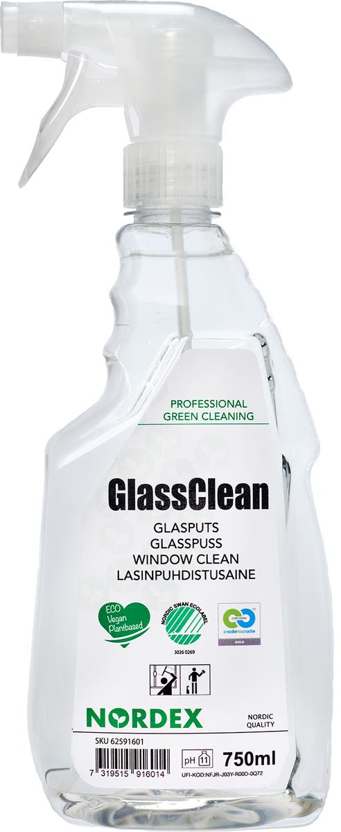 Glasputs för cirkulär rengöring. Fönsterputsmedel GlassClean är ett effektivt bruksfärdigt rengöringsmedel i spray för en daglig cirkulär putsning av glas, speglar och andra släta ytor. Strimmelfri, lämnar inga rester. Oparfymerad.