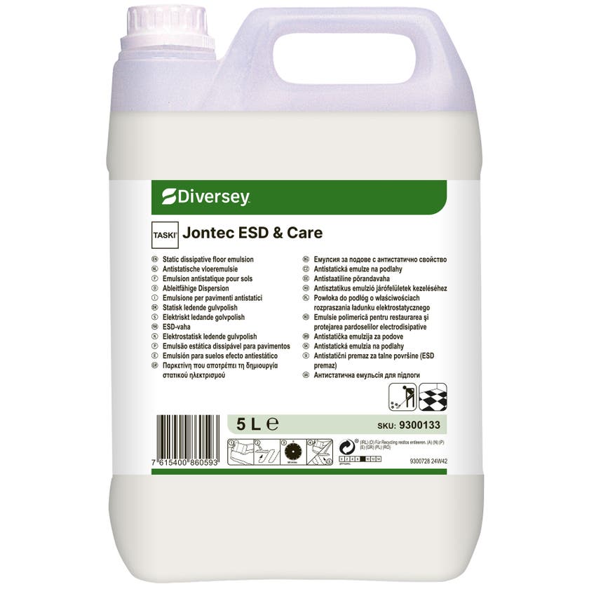 Jontec ESD & Care från Taski är en elektriskt ledande golvpolish, speciellt utvecklad för att förhindra uppbyggnad av statisk elektricitet och skydda känslig elektronisk utrustning. Produkten skapar en slitstark skyddsfilm med hög glans som är kompatibel med de flesta underhållsmetoder. Denna polish är idealisk för miljöer där ESD (elektrostatiska urladdningar) kan orsaka problem – exempelvis i serverrum, laboratorier och andra teknikintensiva ytor. Den passar även utmärkt för ESD-klassade golv där de elektriskt ledande egenskaperna måste bevaras.