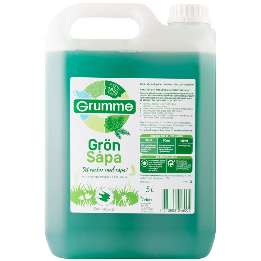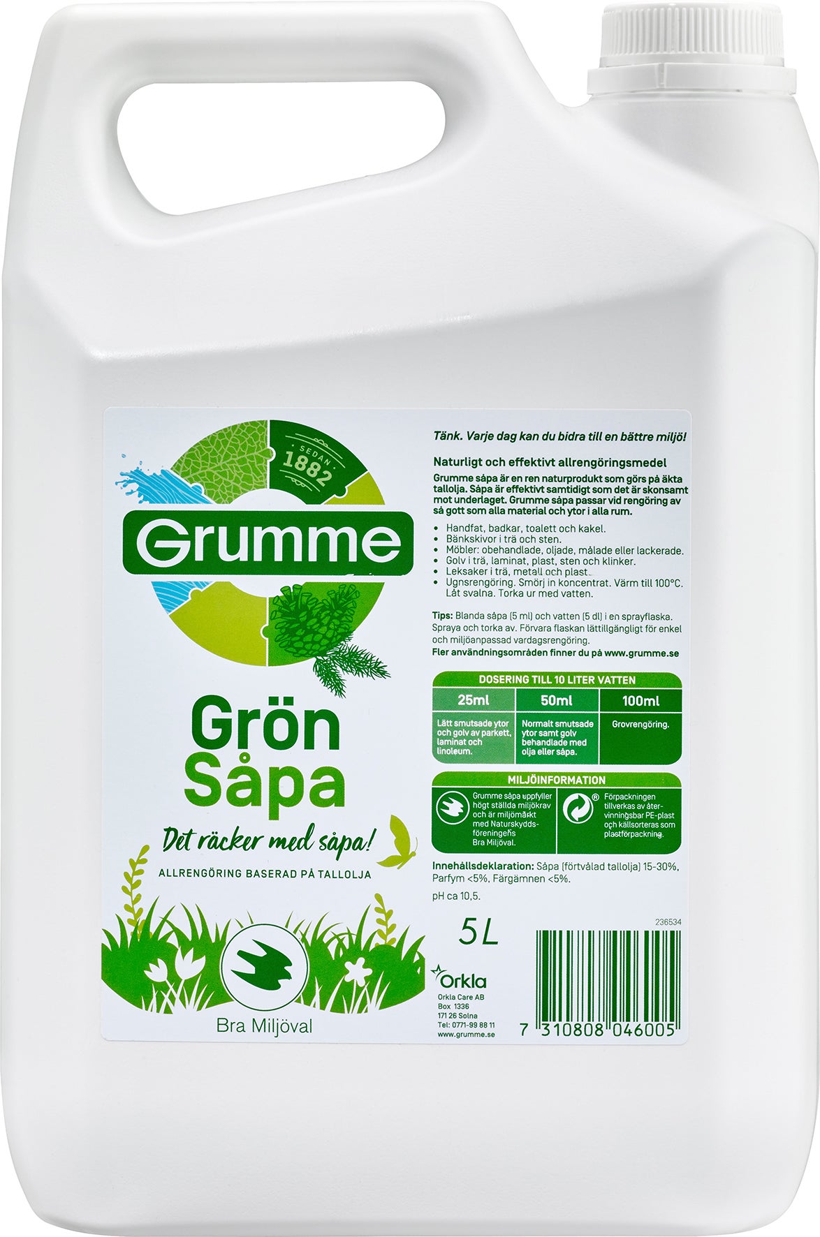 Naturligt och effektivt allrengöringsmedel. Grumme flytande såpa är en ren naturprodukt som görs på äkta tallolja. Såpa är effektivt samtidigt som det är skonsamt mot underlaget och för miljön. Grumme såpa passar vid rengöring av så gott som alla material och ytor i alla rum.