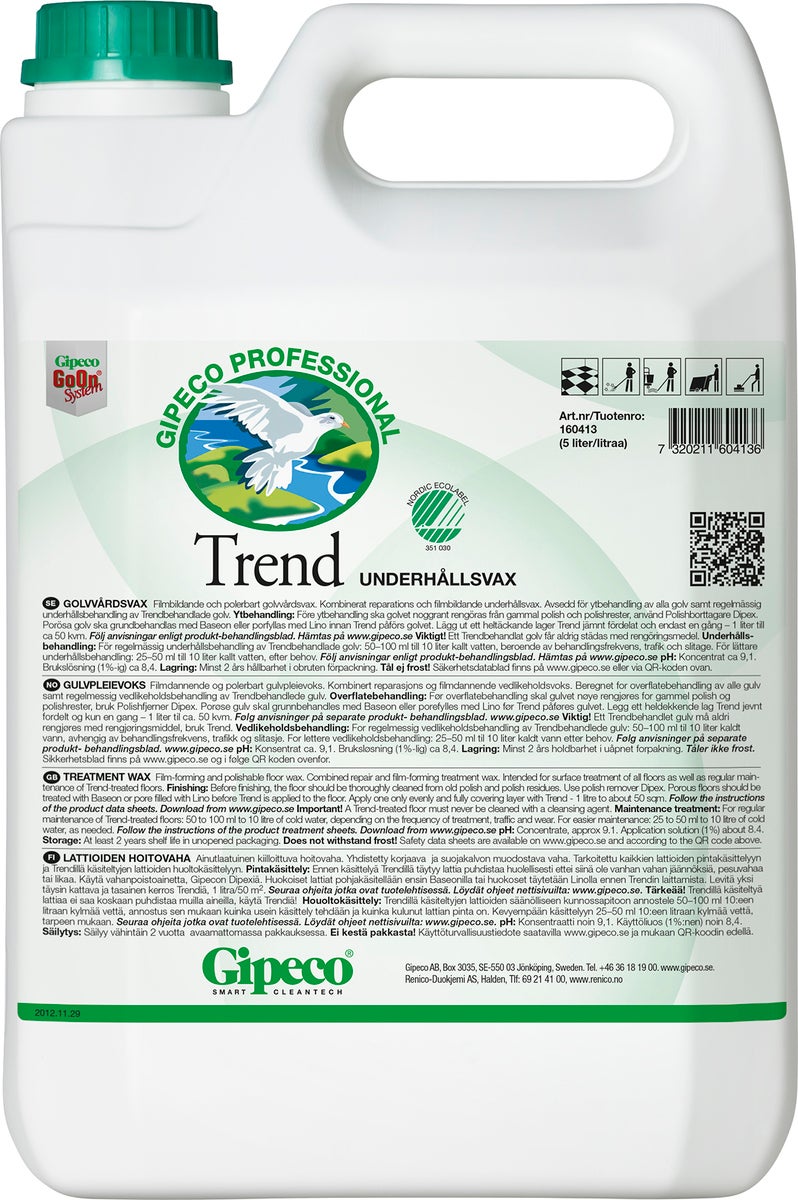 Trend Golv/Underhållsvax det slitstarka golvvaxet för ytbehandling av alla golv. Bildar en elastisk, hård, smutsavvisande och mycket lättstädad ytfilm. Trend kräver mindre arbetsinsats än polish- och mjukvaxbehandling.