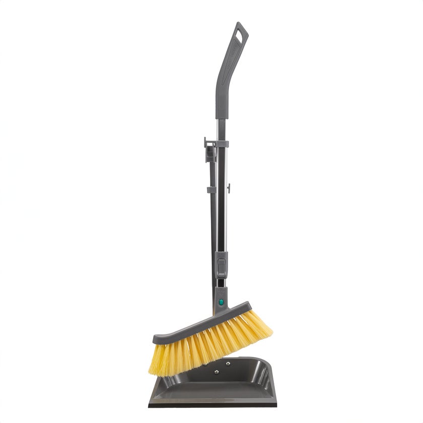 Det kompletta setet innehåller en sopborste med dubbel borstteknik (mjukare strån bak, hårdare fram), ett 94 cm teleskopiskt aluminiumskaft samt en sopskyffel i plåt med utbytbar gummikant och aluminiumskaft. Sopskyffeln väger 360 g och borsen 175 g. Borsten kan hängas direkt på skyffeln. Kan även kompletteras med golvskrapa (art.nr 192025) och extra skaft (192023).
