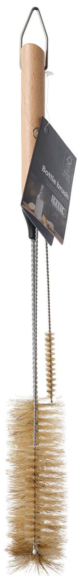 Flaskborste med smal ände för att nå in i PET-flaskor och andra burkar och flaskor med små öppningar. Borsten är lång och böjbar. Svinborst för skonsam och effektiv rengöring. Handtag i FSC®-märkt trä.