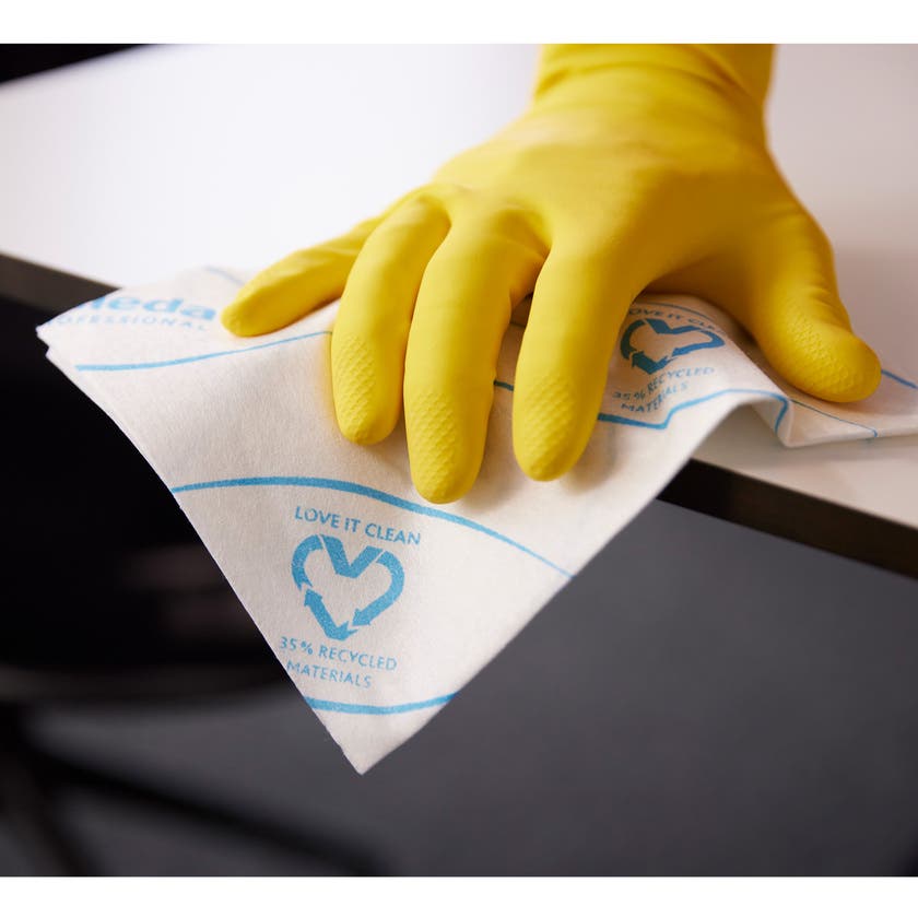 Engångsduken r-MicronSolo från Vileda är en unik kombination av 50% viskos för bra uppsugning och 50% mikrofiber för bästa upptagningen av smuts. Oberoende tester visar att 99,9% av bakterier och virus avlägsnas från ytan – även utan desinfektionsmedel eller kem. Torrt och rent resultat utan ränder och ludd.