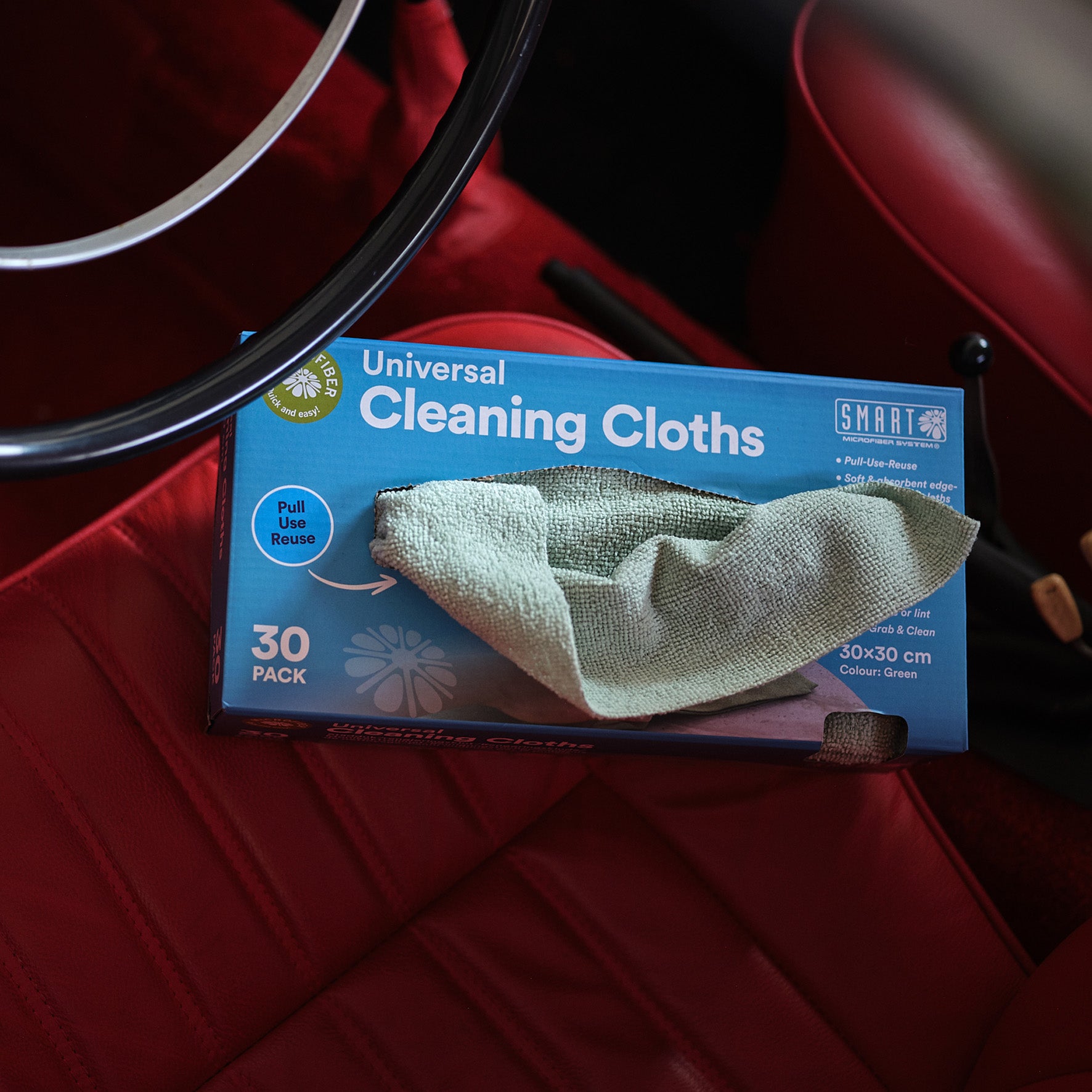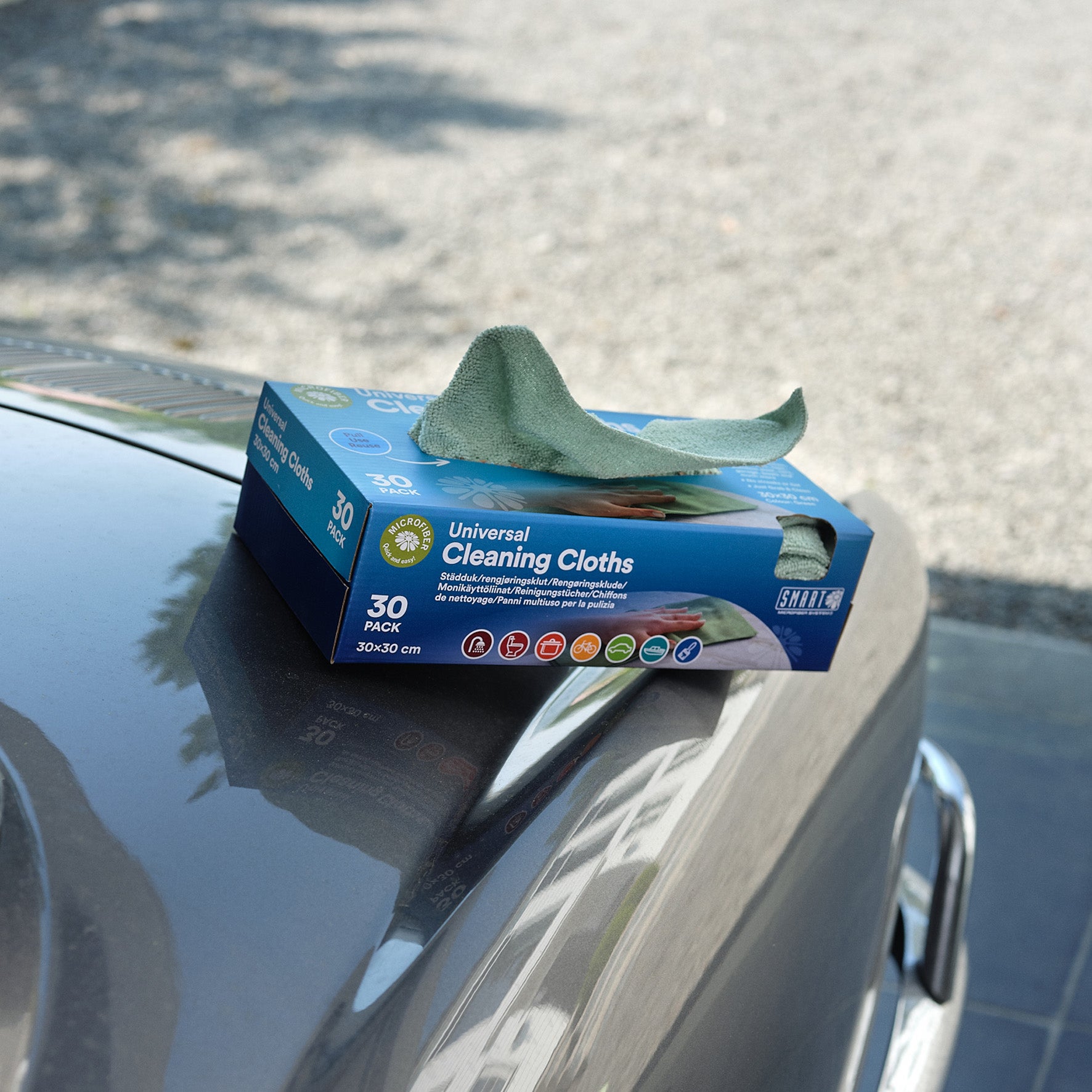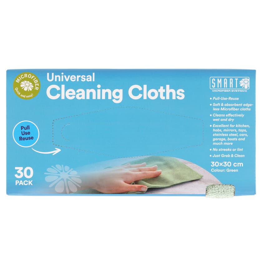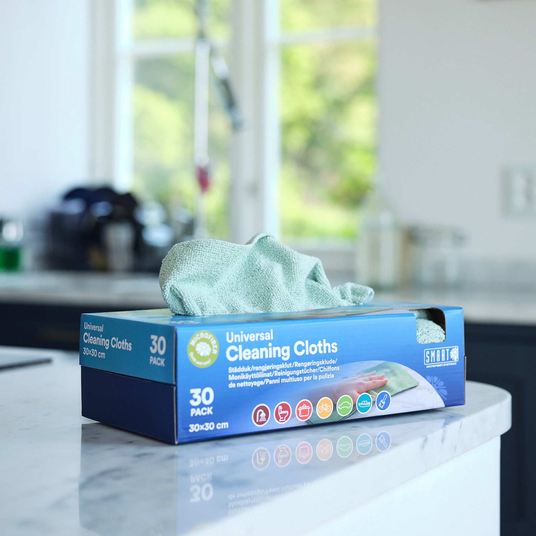 Universal rengöringsdukar i 30-pack i praktisk grön färg. Mjuka, absorberande och kantlösa mikrofiberdukar som rengör effektivt både våta och torra ytor, utan att lämna ludd eller ränder.