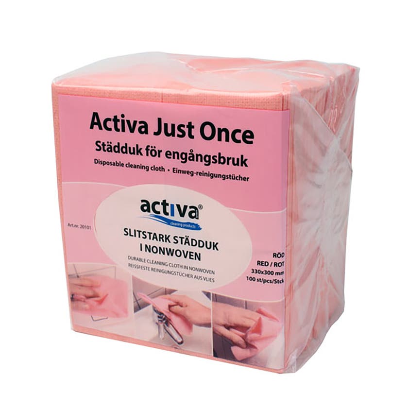 Activa JustOne engångs städdukar. Tålig städduk Nonwoven-duk som kan användas flera gånger utan att gå sönder. Färgkodningen underlättar hygien- och städrutiner. Kan användas både torr och fuktig. Perforerad öppning på förpackningen gör det enkelt att ta en duk åt gången.
