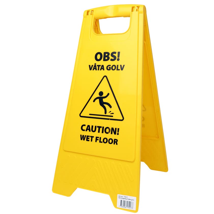 Golvskylt för avspärrning av områden vid exempelvis golvvård eller slaskigt väder. Skylten har tryck på båda sidor: ena sidan med texten "OBS! Våta golv/Caution! Wet floor" och den andra med "Städning pågår!/Cleaning in progress!". Tillverkad i tålig polypropenplast och enkel att fälla ihop när den inte används. Praktisk öppning upptill gör den smidig att bära eller hänga upp.