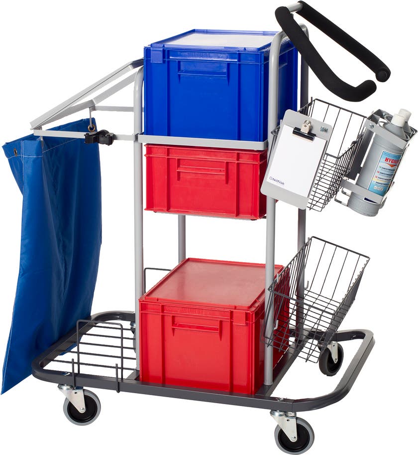 S2-Systemvagn Ekonomi har en tröskelkrypare som är ergonomisk och lätt att använda. Med de lättkörda tysta hjulen så styr du vagnen ergonomiskt och lätt i ditt dagliga arbete. Komplett med 2 st korgar, 2 st skafthållare, 2 st stativhållare, 1 st 15 l back, 2 st 20 l backar och tvättsäck.