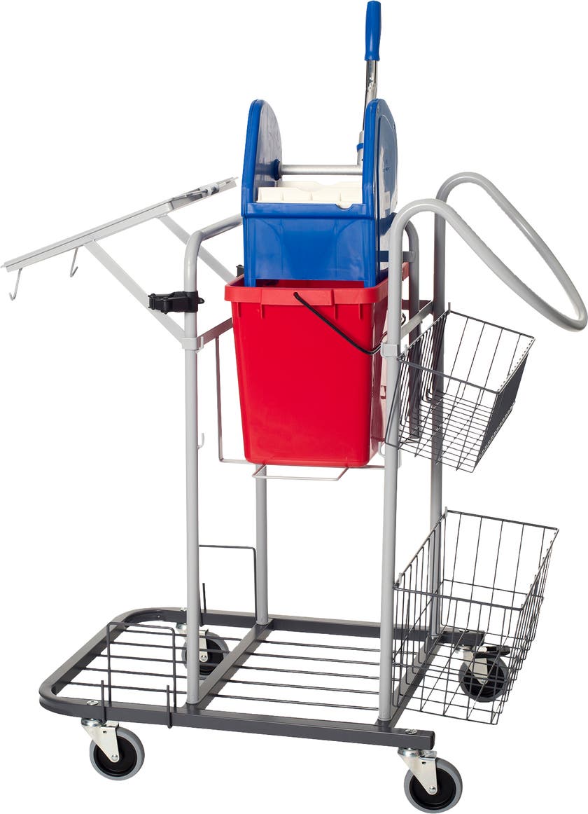Städvagn Trio har svabbpress, 25 l hink, 2 st korgar, 2 st skafthållare, 2 st stativhållare, 1 st 125 l sopsäckshållare, krokar för moppsäck samt 4 st 100 mm hjul varav 1 st bromsat. L 980 mm, B 570 mm, H 1030 mm.