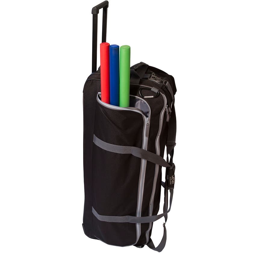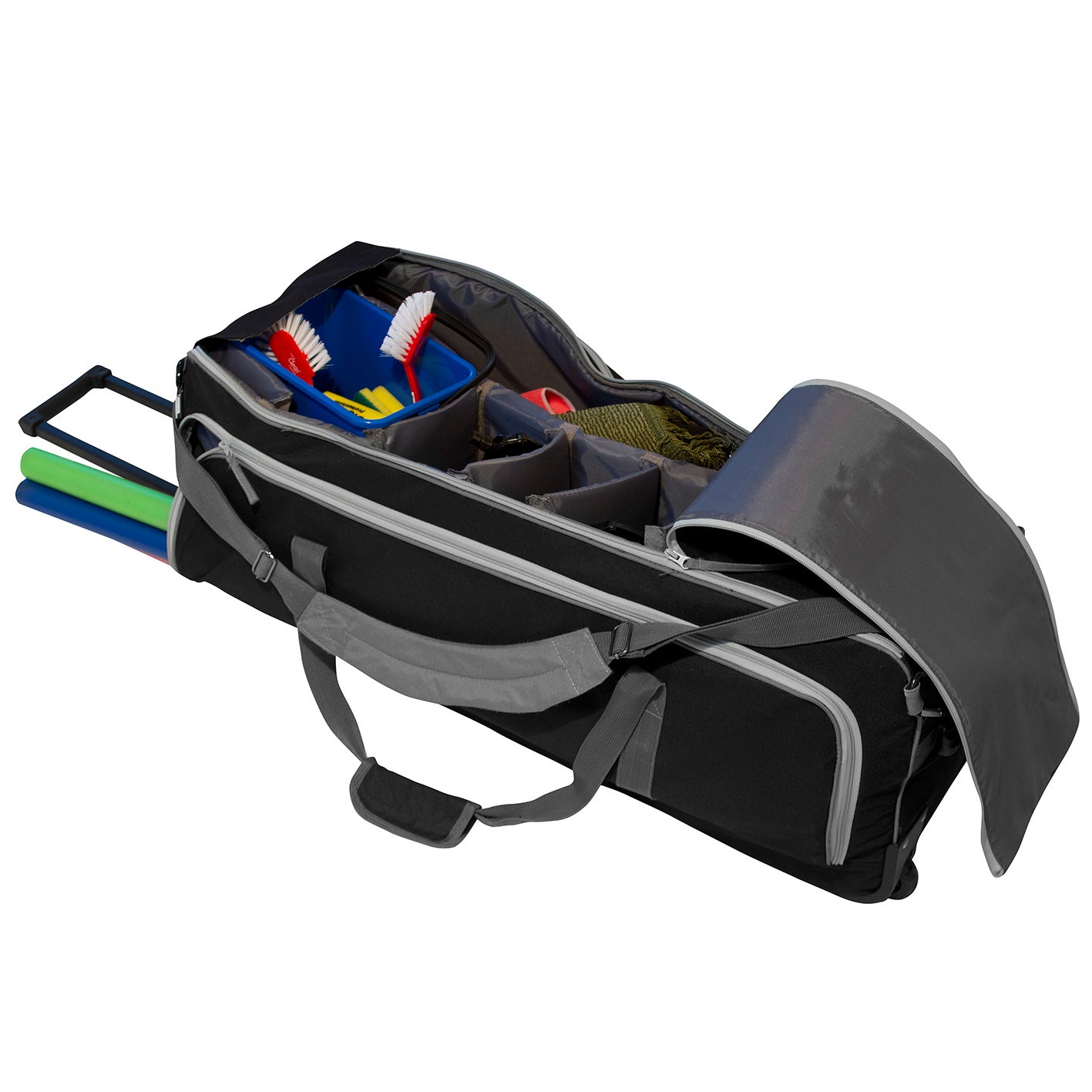Städväska med hjul och draghandtag. Invändiga fack för moppar, microfiberdukar, skaft, stativ, sprayflaskor, svampar, hinkar, lunchlåda m.m.
