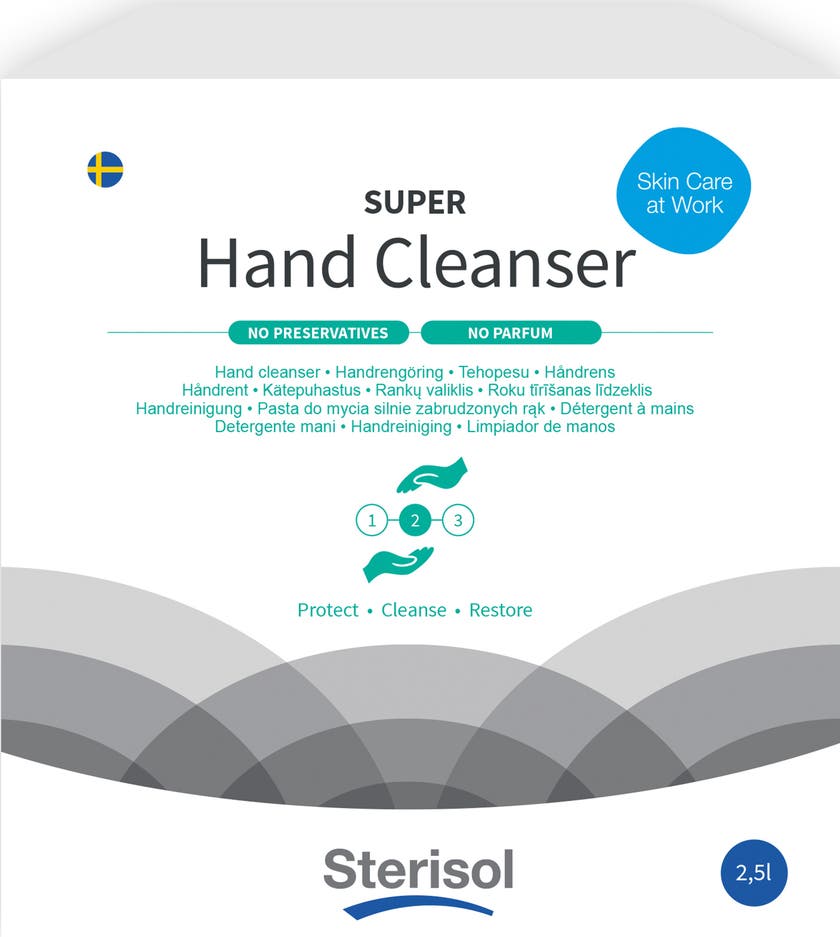 Den flytande tvålen Sterisol SUPER, är en mycket effektiv handrengöring utan konserveringsmedel. Med majs som friktionsmedel för extra tvättkraft mot den mycket svåra smutsen. Den är skonsam mot huden och innehåller vegetabiliska oljor, som både löser smuts och återfettar huden.