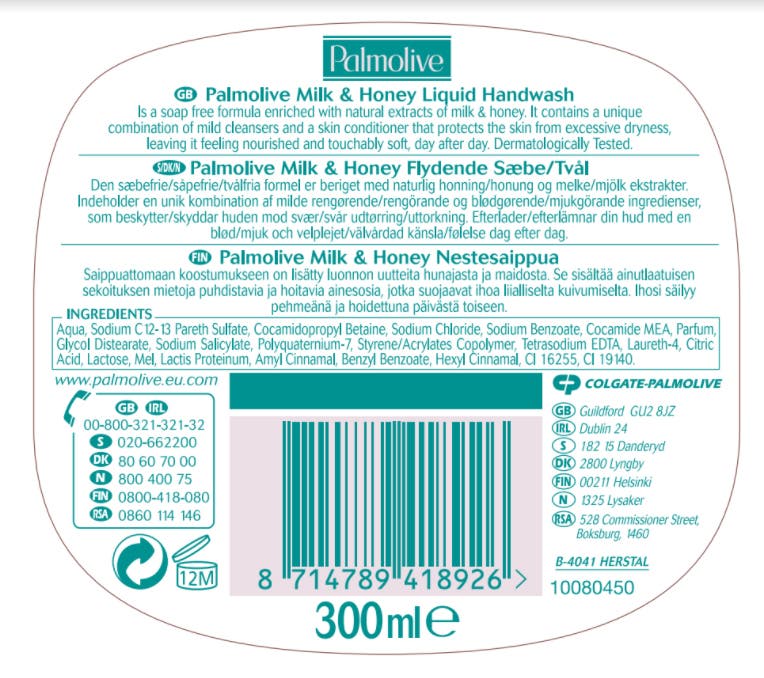 | Namn | Tvål Palmolive Milk&Honey 300 ml |