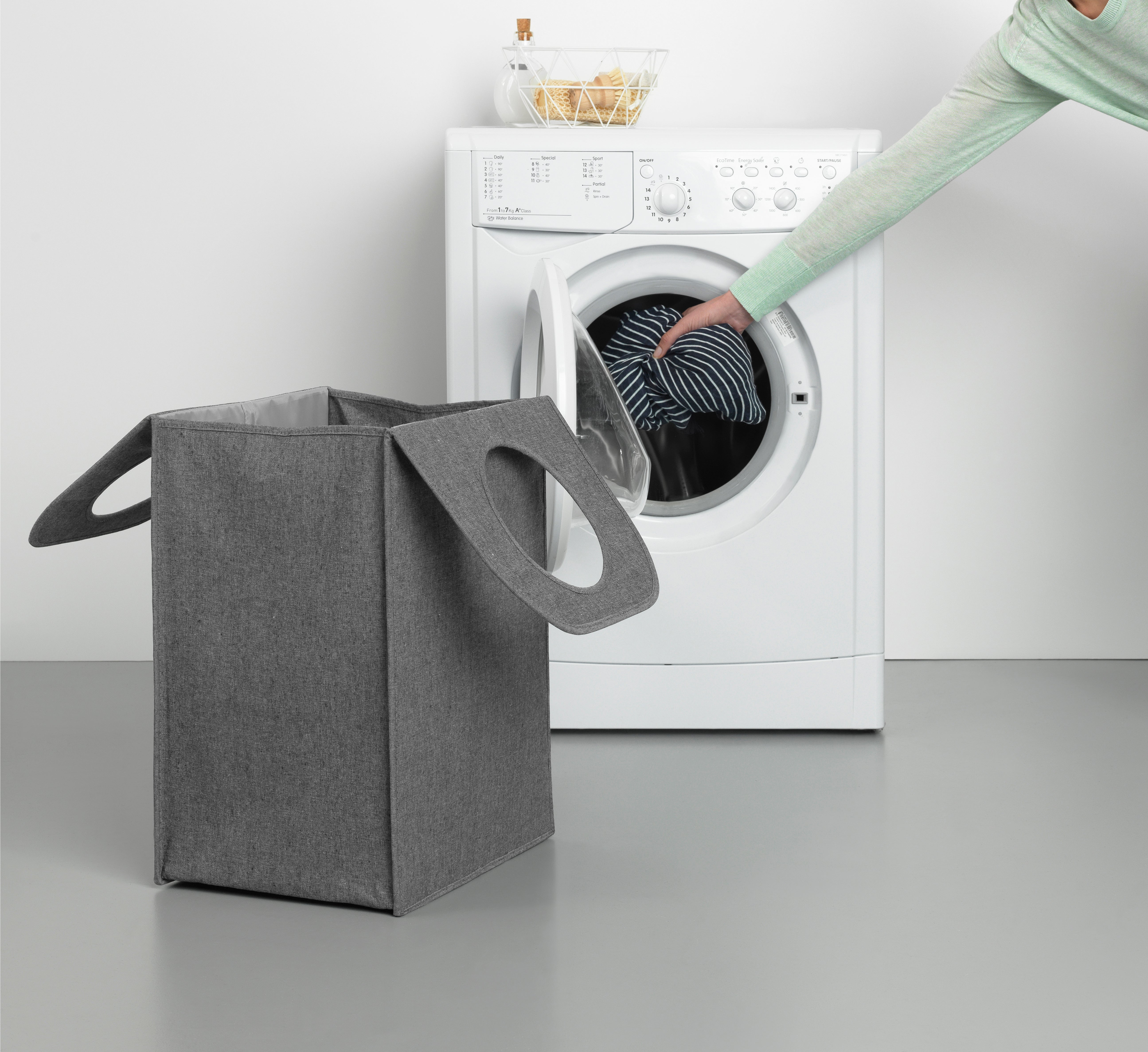 Smart och rymlig tvättkorg från Brabantia. Den robusta tvättkorgen rymmer 55 liter och har en praktisk Quick-drop-öppning. När det är dags att tvätta viker du upp den övre delen så att den formar ett handtag – sen kan du lätt bära med den till tvättmaskinen. Problemfri användning – 2 års garanti och service från Brabantia.