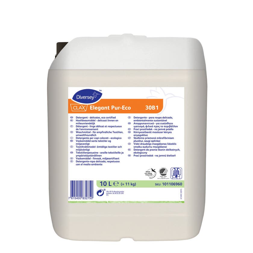 Tvättmedel Clax Pur-Eco 30B1. Clax Elegant Pur-Eco är utvecklat för användning i professionella tvätterier inkl OPL tvätterier. Clax Elegant Pur-Eco är ett lågalkaliskt, milt tvättmedel, uppbyggt av en effektiv kombination av tensider, avhärdningsmedel och enzymer. Produkten är baserad på tvål och citrat, vilket ger en god avhärdningsförmåga, hög dispergeringsförmåga samt förhindrar effektivt återutfällningar av smuts och salter på textilierna. Clax Elegant Pur-Eco är uppbyggd av en kombination av anjontensider och nonjontensider, vilket medför ett utmärkt tvättresultat på fet- och oljerik smuts. Produkten innehåller även polymer för att minska risken för färgfällning. Ett protolytiskt enzym spjälkar effektivt proteiner så att dessa blir vattenlösliga. Exempel på smuts som innehåller sådana proteiner är blod, svett, hudpigment och matrester. Lipas enzymer bryter ner den feta smutsen. Clax Elegant Pur-Eco är ett komplett tvättmedel för kulör- vit- och fintvätt anpassad för fastighetstvättstugor, tvättgods från sjukhus, hotell och restauranger. Ingredienserna i Clax Elegant Pur-Eco har valts med största omsorg för miljön.