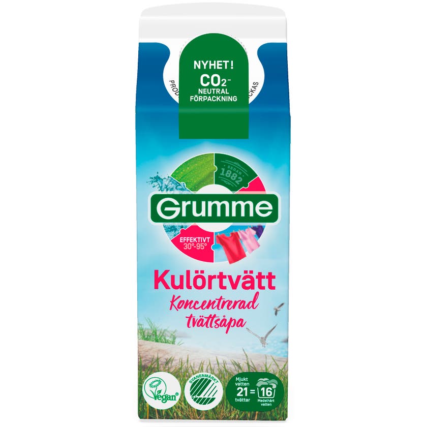 Tvättmedel kulör Grumme. Flytande Kulörtvätt. Tvättar effektivt rent redan vid 30 grader och är skonsamt mot färger och miljön. Låg dosering och räcker upp till 21 tvättar.