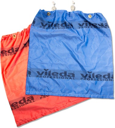 Hållbar röd tvättsäck med öglor från Vileda Professional.