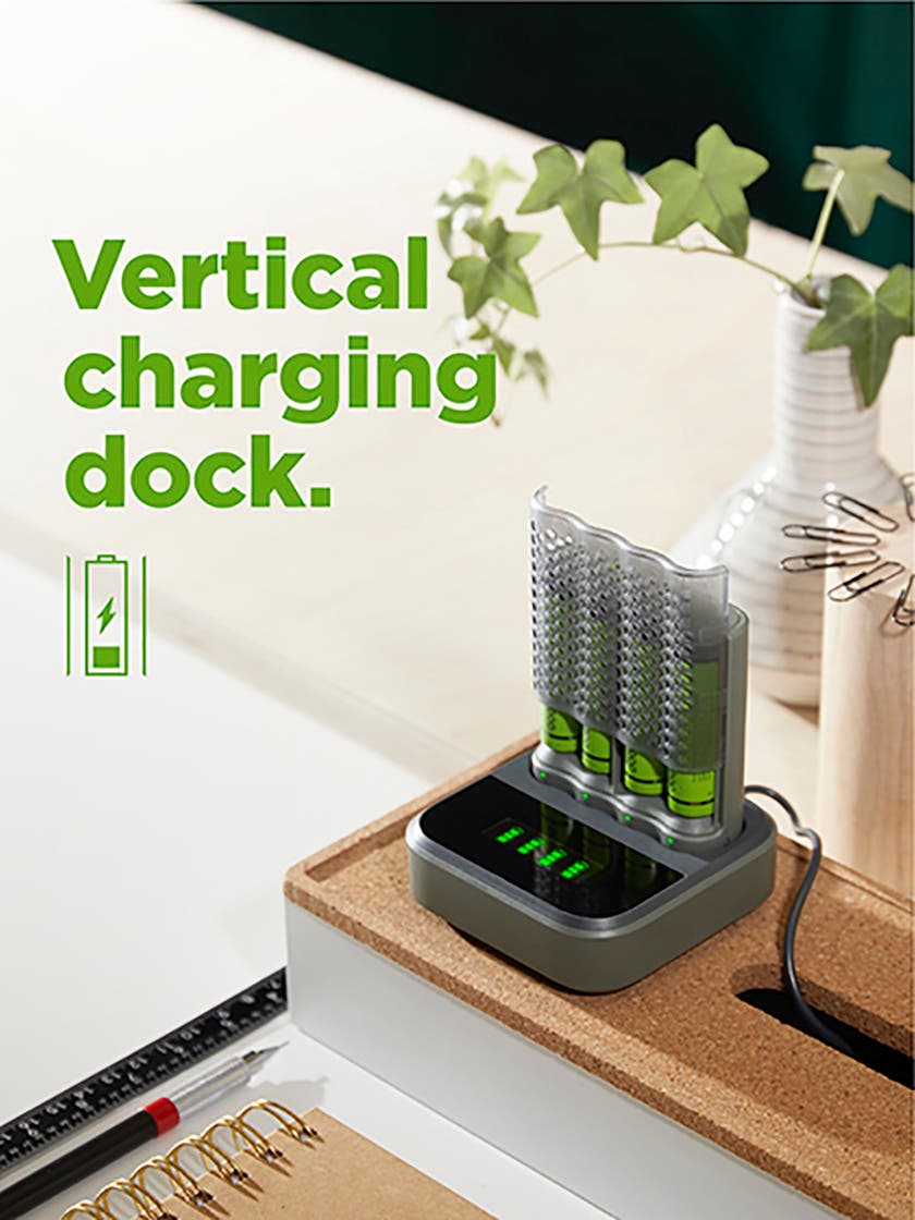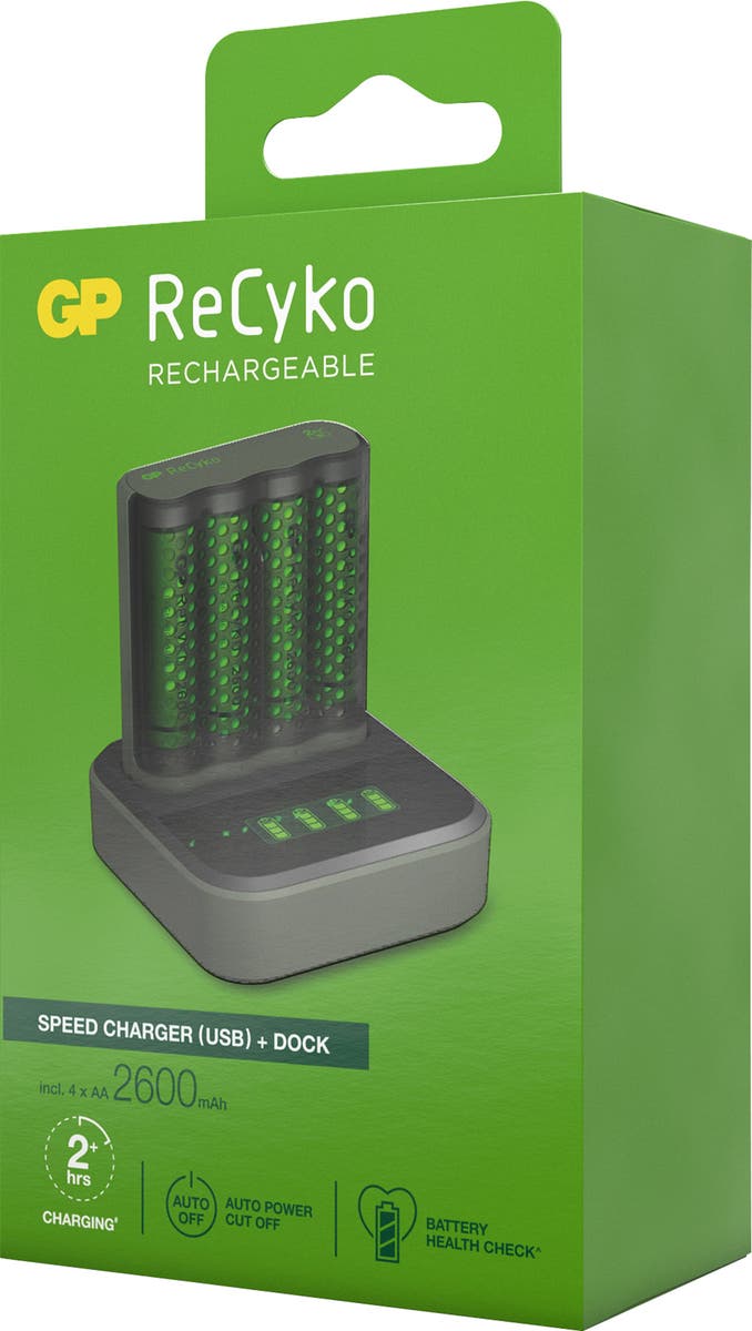 Batteriladdare GP ReCyko Speed med 4xAA 2600mAh batterier. En elegant och snabb batteriladdare med smarta säkerhets- och tekniska funktioner som kan ladda upp till fyra AA- eller AAA-batterier samtidigt. Paketerad tillsammans med GP:s D451-laddstation, vilket ger viktiga batteridetaljer som gör din laddning lättare än någonsin. ReCyko Speed Charger - M451 laddare. Det tar 2+ timmar för M451 för att fulladda två batterier, eller 4+ timmar för att fulladda fyra batterier (2100mAh AA-batterier) via USB-kontakt. De tvåfärgade LED-dioderna indikerar laddstatus samt om några engångs- eller dåliga batterier har satts in i laddaren. En annan säkerhetsfunktion är -dV-fullladdningövervakningen som stänger av laddaren när batterierna är fulladdade. Detta förhindrar överladdning, överström och kortslutning, samt förbättrar batteriernas livslängd. D451 laddstation. D451 är en advancerad laddstation för din ReCyko-laddare. Den förser dig med viktiga batteridetaljer och gör din laddning lättare än någonsin. Laddstationens unika design tar upp mindre yta genom att hålla din ReCyko-laddare i en vertikal position, dessutom laddas den via USB-kontakt vilket gör den optimal för hemma- så som kontorsbruk. När en laddare sitter i stationen så visar LCD-displayen laddstatus för varje batteri samt batteriets skick, så att du påminns när det är dags att byta ut gamla batterier.