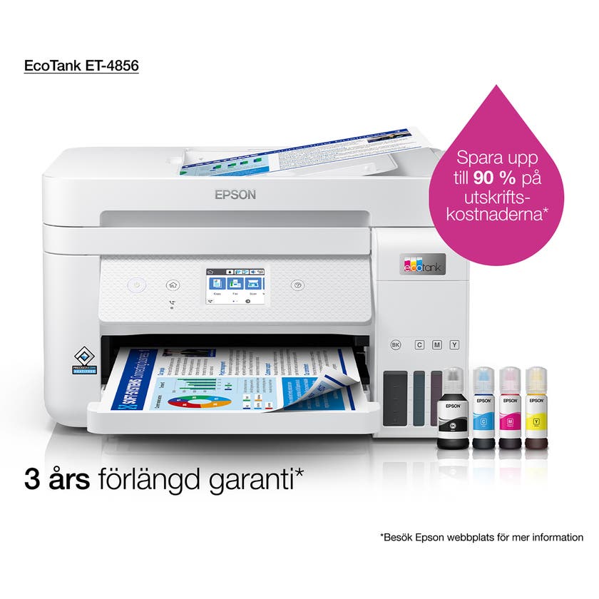 Bläckstråleskrivare Epson EcoTank ET-4856. Aldrig mer bläckpatroner! Med snabba utskrifter i företagskvalitet till en extremt låg kostnad är denna bläckstråleskrivare med multifunktion, fax och ADM den perfekta lösningen för hemmakontor.