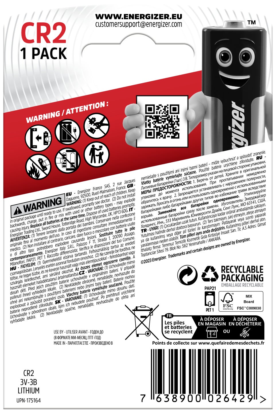 Energizer Batteri Lithium CR2. Missa aldrig att fånga ett ögonblick: Energizer CR2 Photo Batteries levererar exakt, långvarig prestanda till din digitala SLR-kamera och fotoutrustning. Men det stannar inte vid foton: Dessa litiumbatterier kan också driva på högteknologiska enheter som din miniräknare, surfplatta och mer. Med en lagringstid på upp till tio år kan du vara säker på att de håller sig fräscha tills du behöver dem