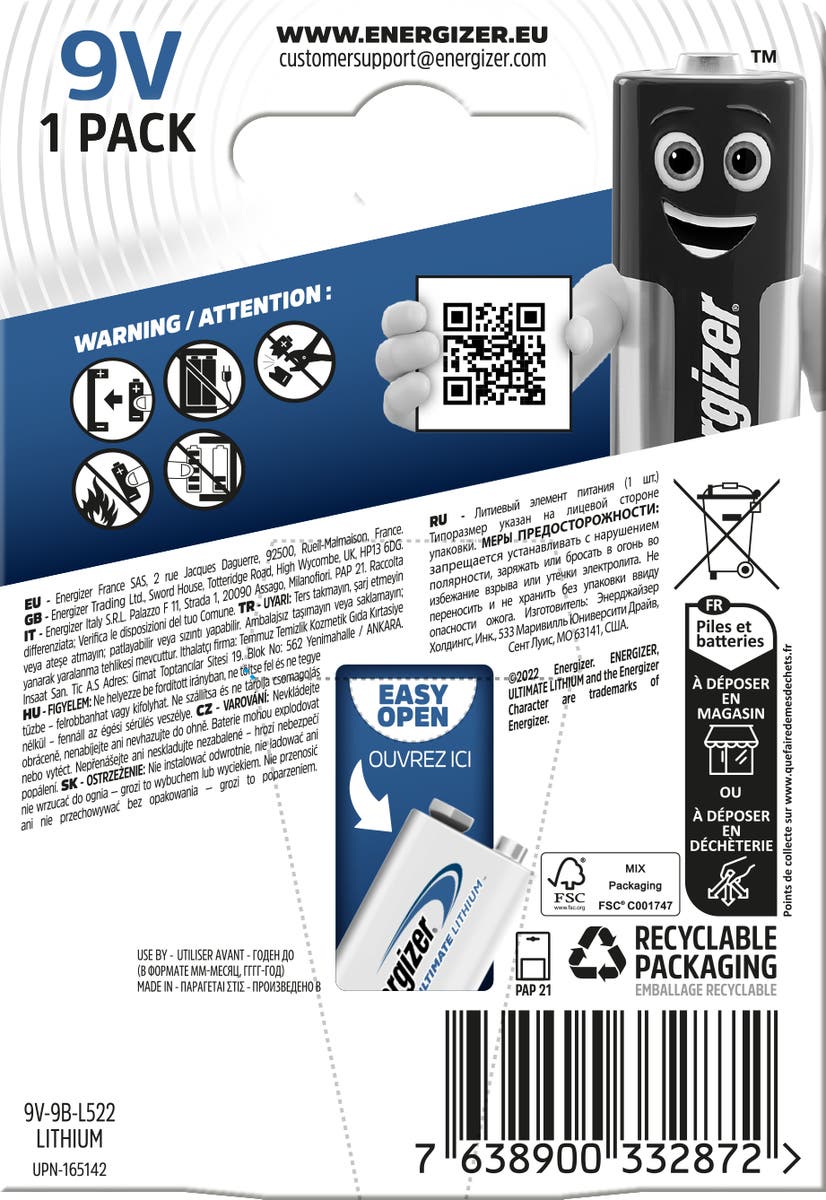 Energizer Batteri Lithium 9V. Varje batteris säkerhetsmedvetna, läckagesäkra design (baserat på standardanvändning) ger dig förtroendet för användning i dina mest älskade och viktigaste apparater. Batterierna kan fungera i extrema temperaturer (från -40 ° C till 60 ° C) och behåller laddningen i upp till 10 år vid förvaring, vilket gör Ultimate Lithium-batterier till det självklara valet för dina viktigaste enheter.