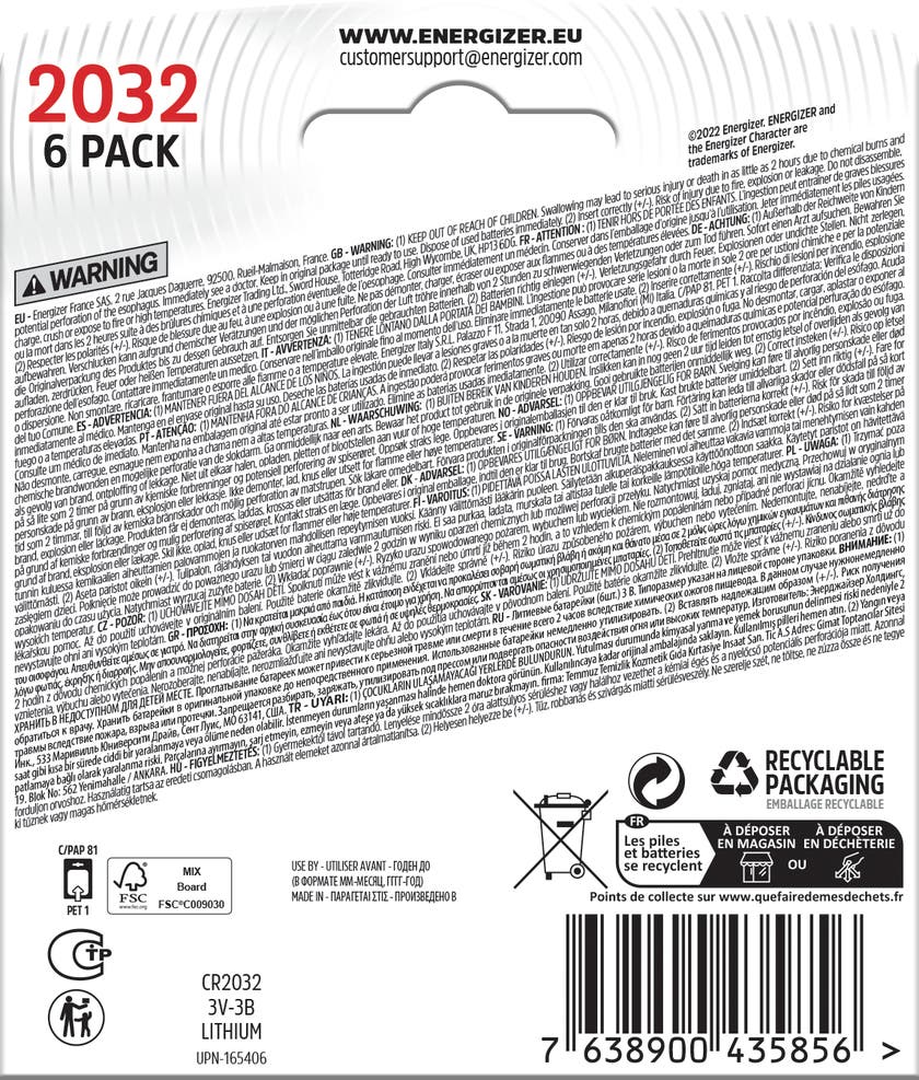 | Namn | Energizer Batteri Lithium CR2032 6-pack |