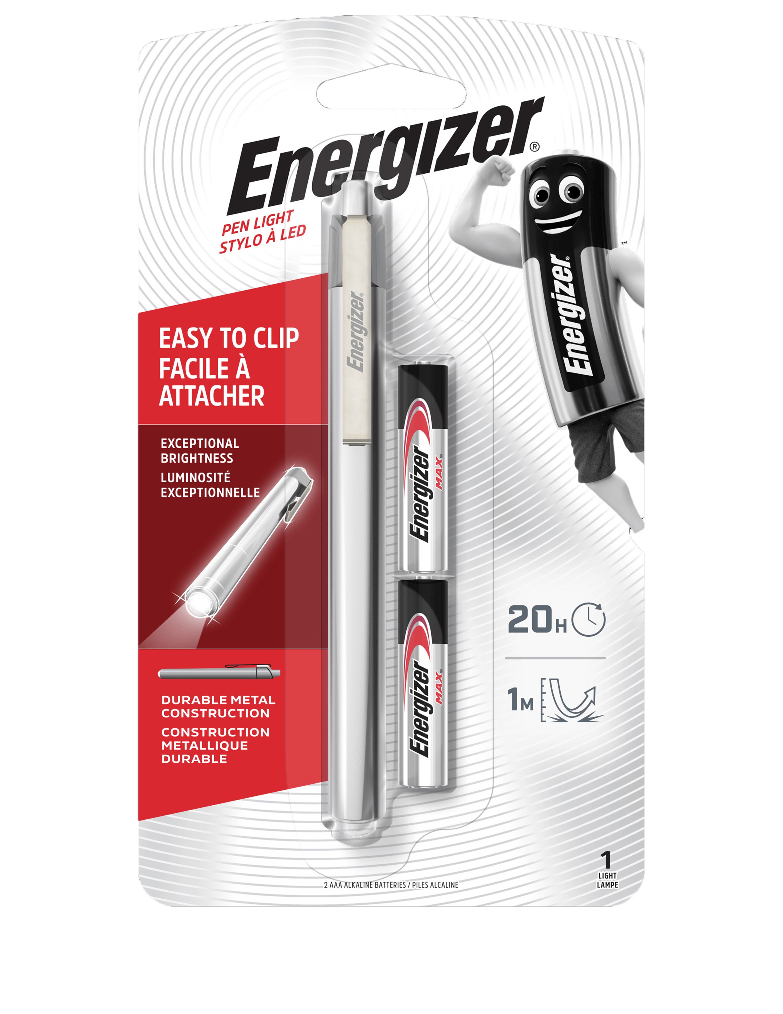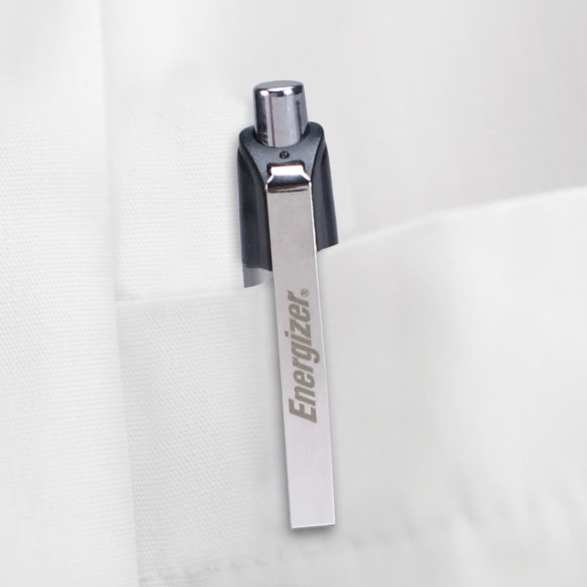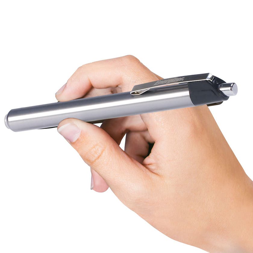 Energizer Metal Penlight är en liten, men effektiv och pålitlig pennlampa med LED. Lätt att använda och lätt att förvara – ett praktiskt tillbehör i verktygslådan, handskfacket eller portföljen. Med slitstarkt metallhölje, stöttålig upp till 1 meter. Lampan ger dig enastående ljusstyrka och lång drifttid. Den robusta metallklämman ger säkert grepp. Praktisk brytarknapp baktill möjliggör enhandsgrepp.