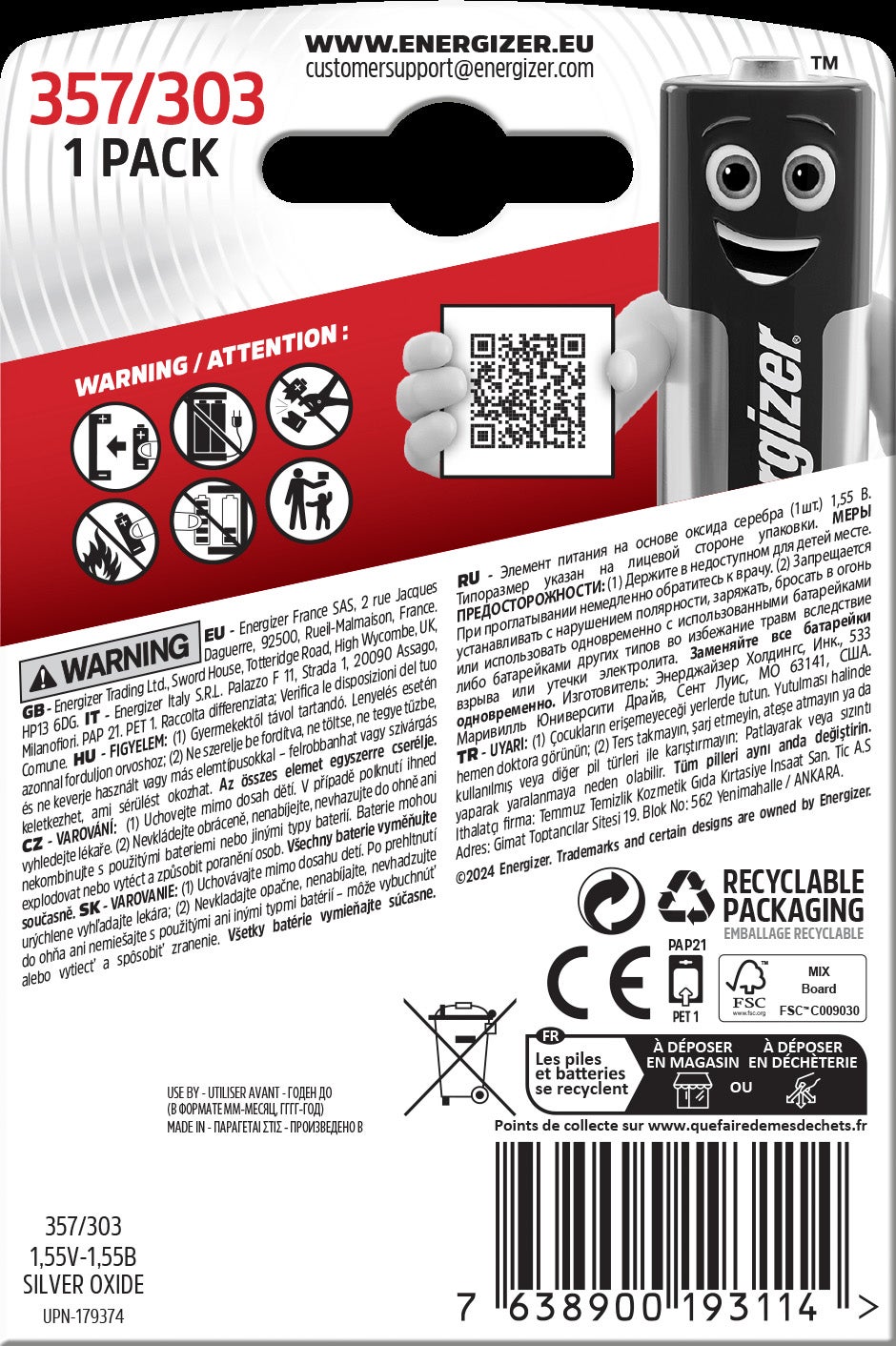 Energizer Klockbatteri Silveroxid 357/303. Silveroxidbatteri som levererar långvarig ström till dina specialbatteridrivna enheter, från hushållselektronik som nyckellösa inmatningssystem, till e-böcker, leksaker, miniräknare och klockor, till hjärtfrekvens- och glukosmonitorer. Och dessa kvicksilverfria myntbatterier behåller lagringen i upp till 5 år vid lagring. Välj Energizer specialbatterier för långvarig effekt som du kan lita på.