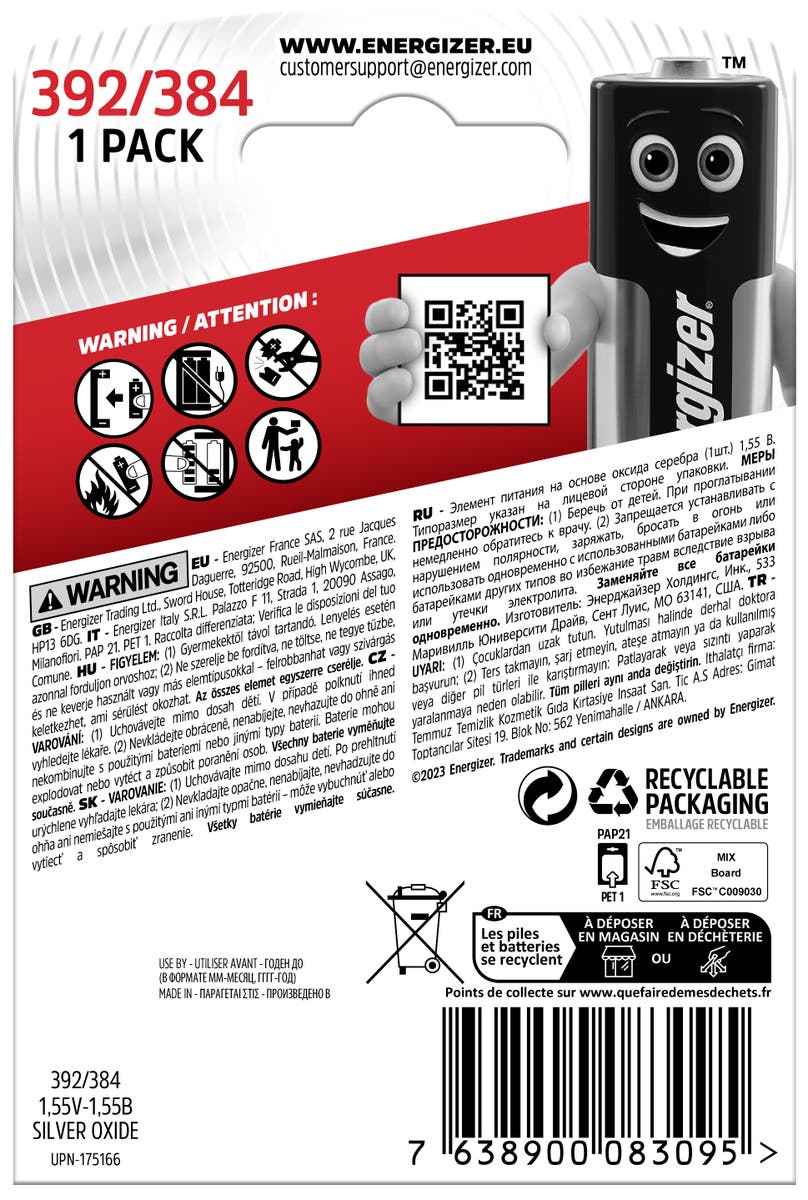 Energizer Klockbatteri Silveroxid 392/384. Det finns vanliga specialbatterier, och sedan finns det Energizer Specialbatterier. Energizer 392/384 silveroxidsbatteri levererar långvarig ström till dina specialbatteridrivna enheter, från hushållselektronik som nyckellösa inmatningssystem, till e-böcker, leksaker, miniräknare och klockor, till hjärtfrekvens- och glukosmonitorer. Och dessa kvicksilverfria specialcellsbatterier behåller laddningen i upp till 5 år vid förvaring. Välj Energizer specialbatterier för långvarig effekt som du kan lita på.
