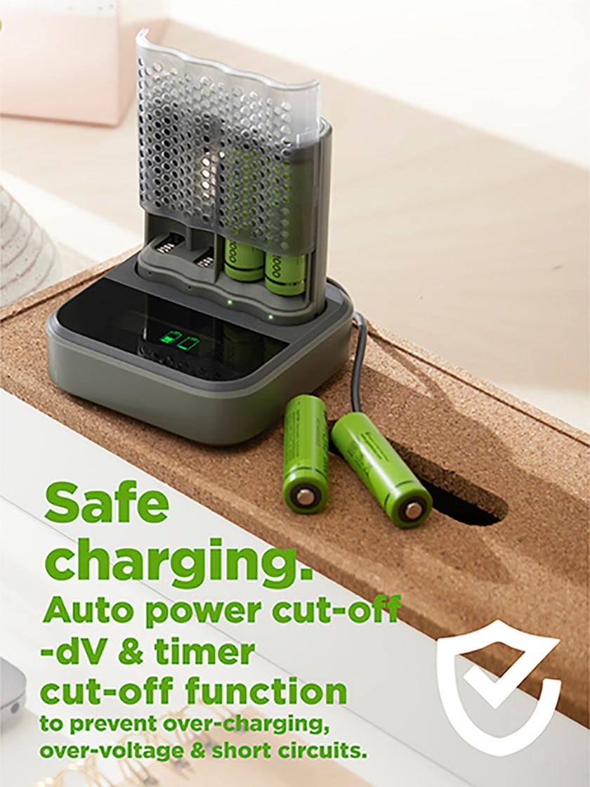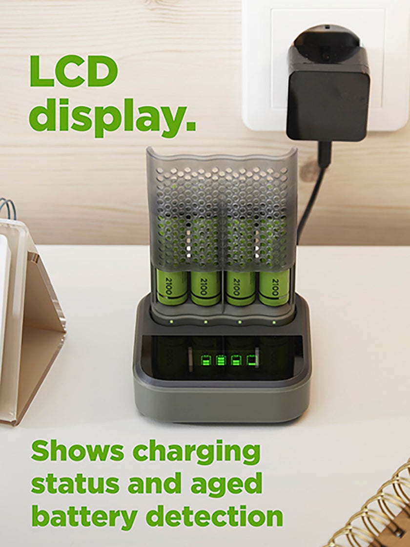 Batteriladdare GP ReCyko Speed med 4xAA 2600mAh batterier. En elegant och snabb batteriladdare med smarta säkerhets- och tekniska funktioner som kan ladda upp till fyra AA- eller AAA-batterier samtidigt. Paketerad tillsammans med GP:s D451-laddstation, vilket ger viktiga batteridetaljer som gör din laddning lättare än någonsin. ReCyko Speed Charger - M451 laddare. Det tar 2+ timmar för M451 för att fulladda två batterier, eller 4+ timmar för att fulladda fyra batterier (2100mAh AA-batterier) via USB-kontakt. De tvåfärgade LED-dioderna indikerar laddstatus samt om några engångs- eller dåliga batterier har satts in i laddaren. En annan säkerhetsfunktion är -dV-fullladdningövervakningen som stänger av laddaren när batterierna är fulladdade. Detta förhindrar överladdning, överström och kortslutning, samt förbättrar batteriernas livslängd. D451 laddstation. D451 är en advancerad laddstation för din ReCyko-laddare. Den förser dig med viktiga batteridetaljer och gör din laddning lättare än någonsin. Laddstationens unika design tar upp mindre yta genom att hålla din ReCyko-laddare i en vertikal position, dessutom laddas den via USB-kontakt vilket gör den optimal för hemma- så som kontorsbruk. När en laddare sitter i stationen så visar LCD-displayen laddstatus för varje batteri samt batteriets skick, så att du påminns när det är dags att byta ut gamla batterier.