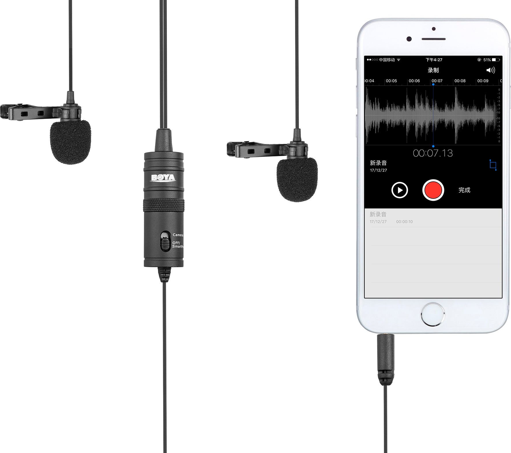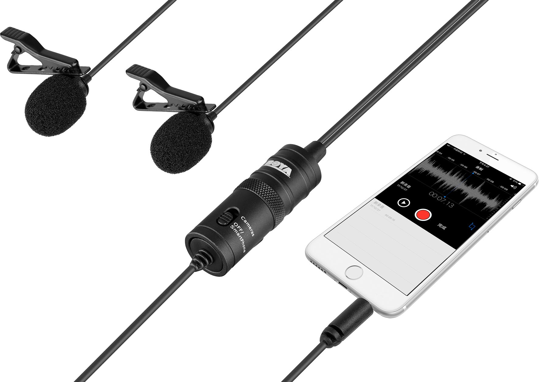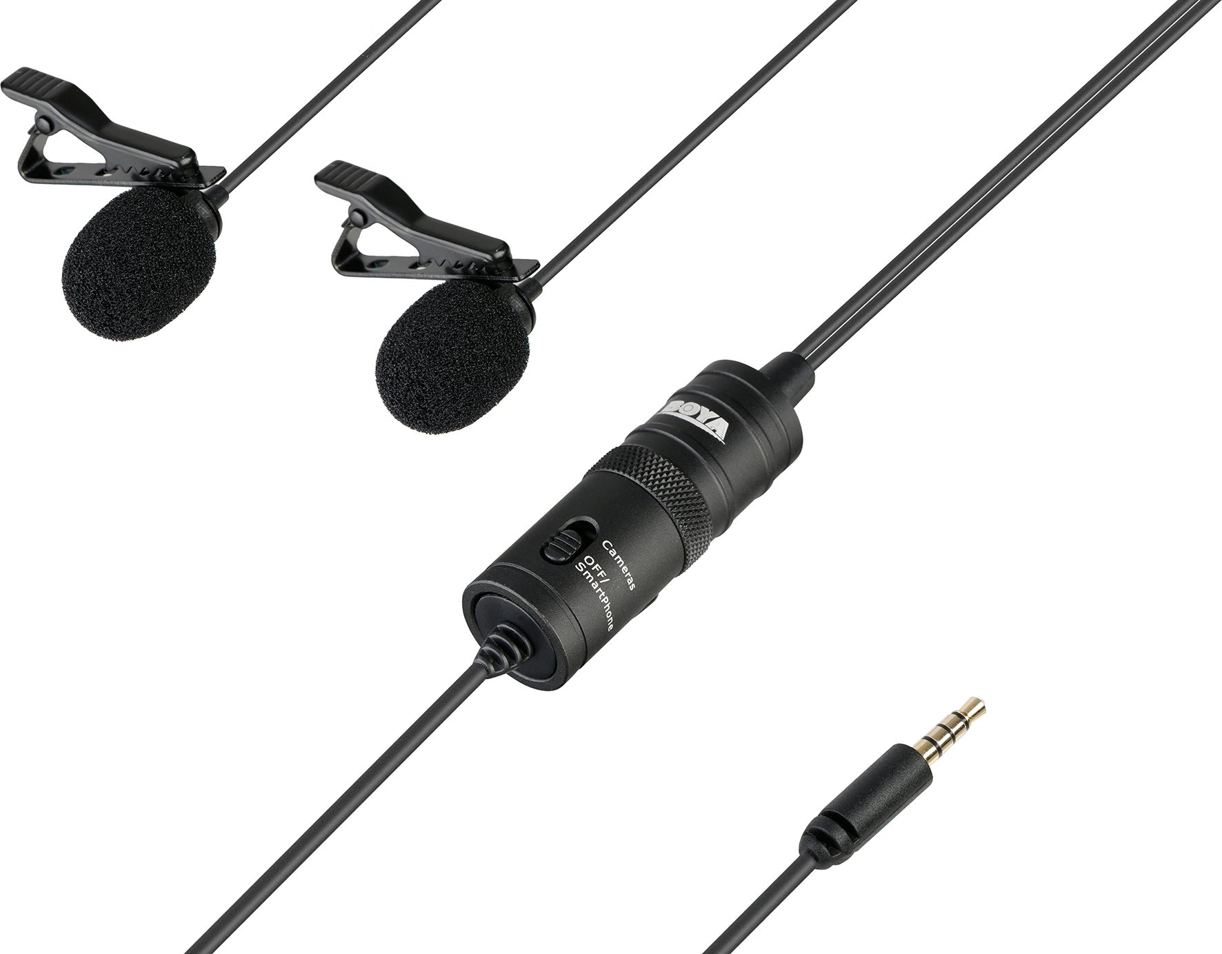 Dubbel myggmikrofon, BY-M1DM Lavalier. BOYA BY-M1DM är en uppsättning med två rundupptagande myggmikrofoner, med en enda 3,5 mm stereokontakt, som kan användas med smartphones, DSLR-kameror, videokameror, ljudinspelare, PC och andra inspelningsenheter.