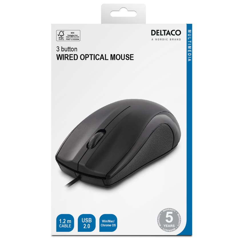 Trådansluten datormus med optisk sensor. Ansluts till datorn med en USB-A hane kontakt och 1,2 m kabel. Du behöver inte installera några drivrutiner, anslut bara musen till en ledig USB-port på din dator och kör igång!