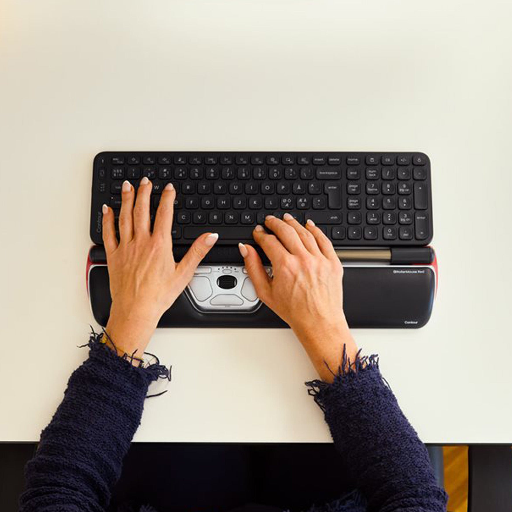 Det trådlösa tangentbordet Balance har en ergonomisk design med tunn och låg profil som håller dina händer i en naturlig vinkel och dina armar centrerade. Detta minimerar räckvidden och hjälper dig undvika axel- och handledsbelastning. Att använda Balance tillsammans med en RollerMouse eller Contour Touch ger en komplett arbetsuppsättning för smärtlindring och komfort under långa arbetsdagar.