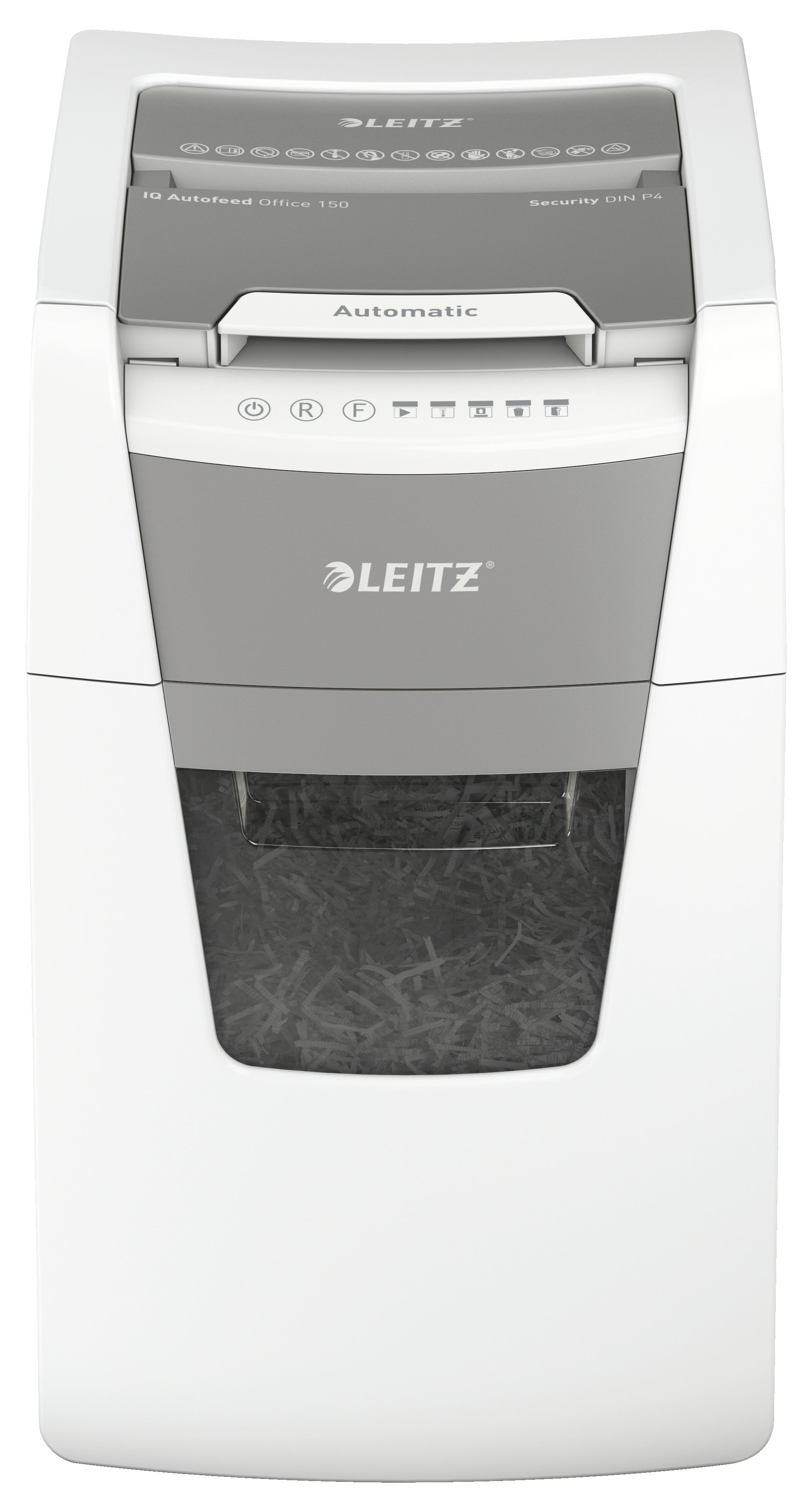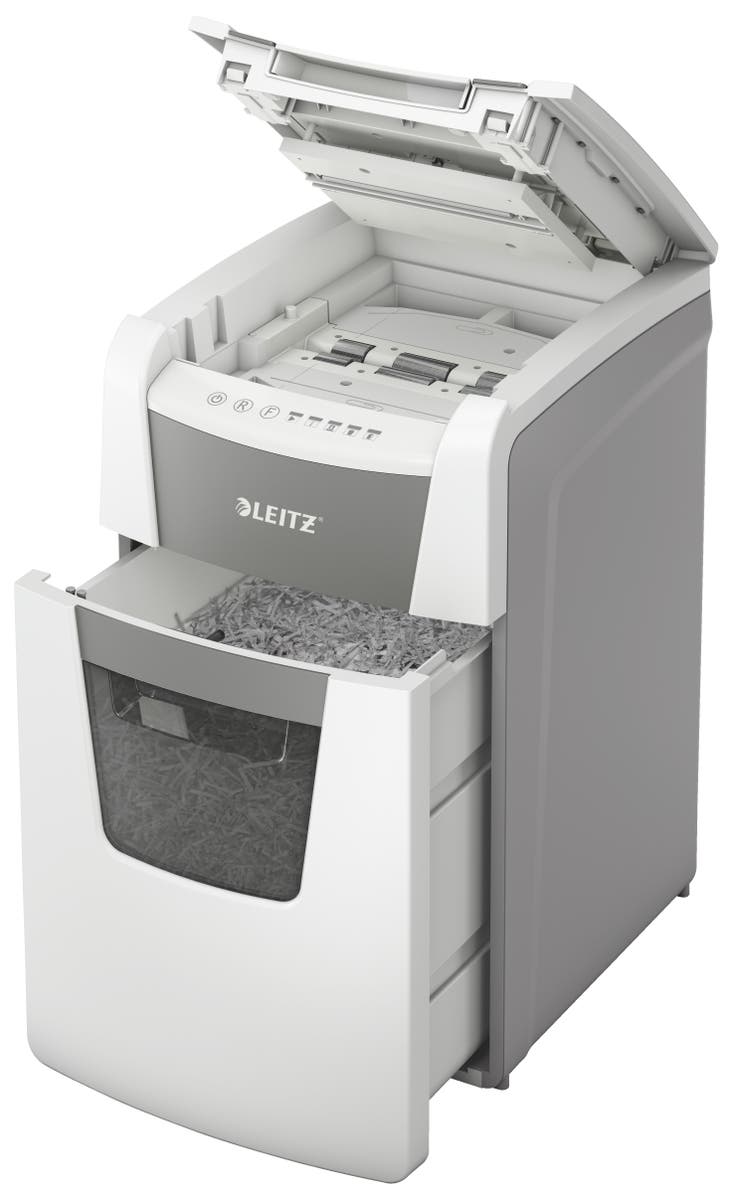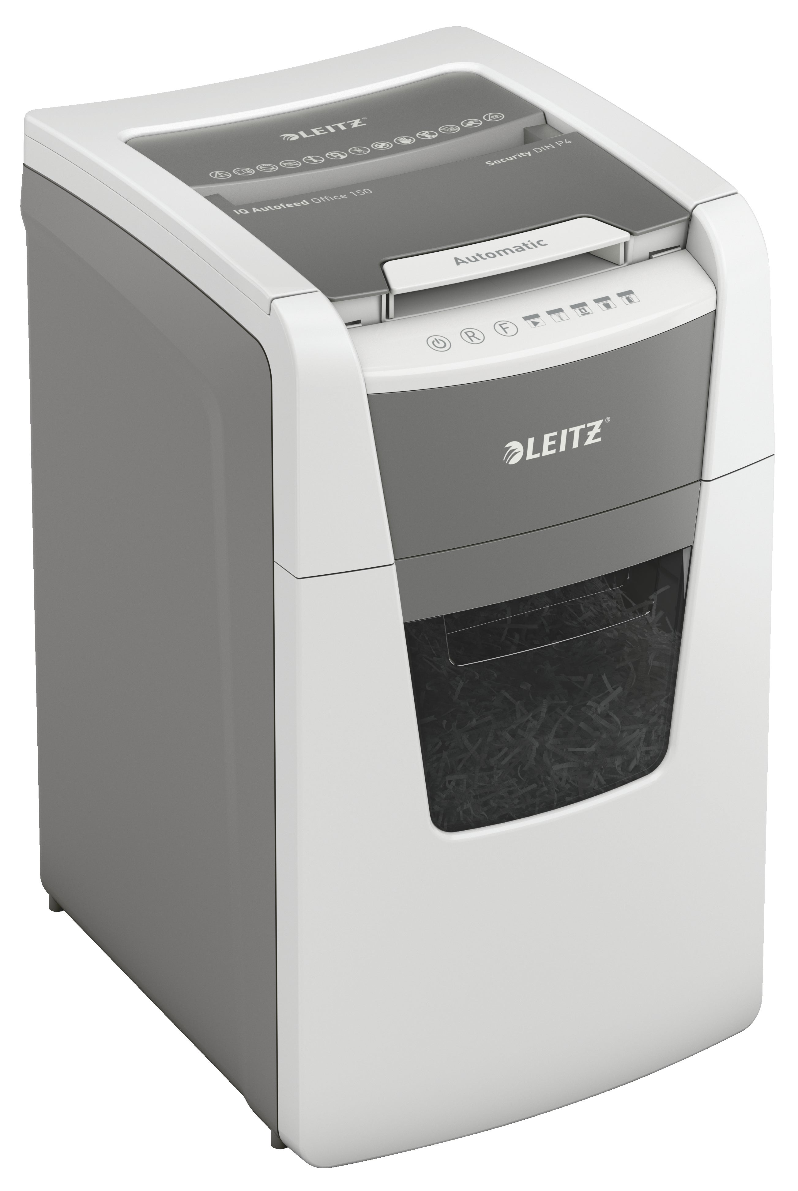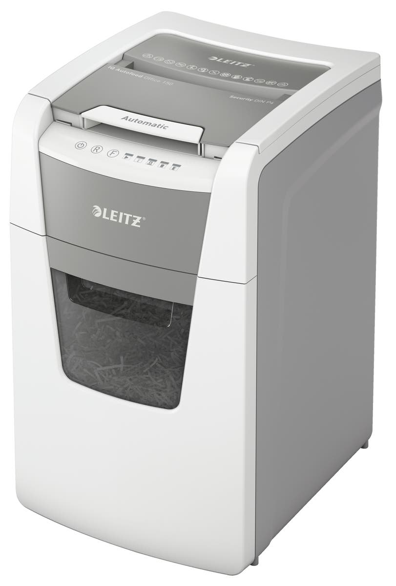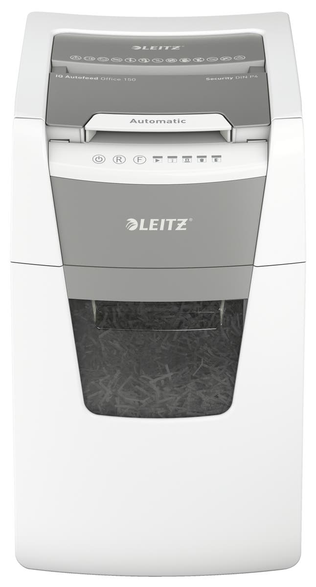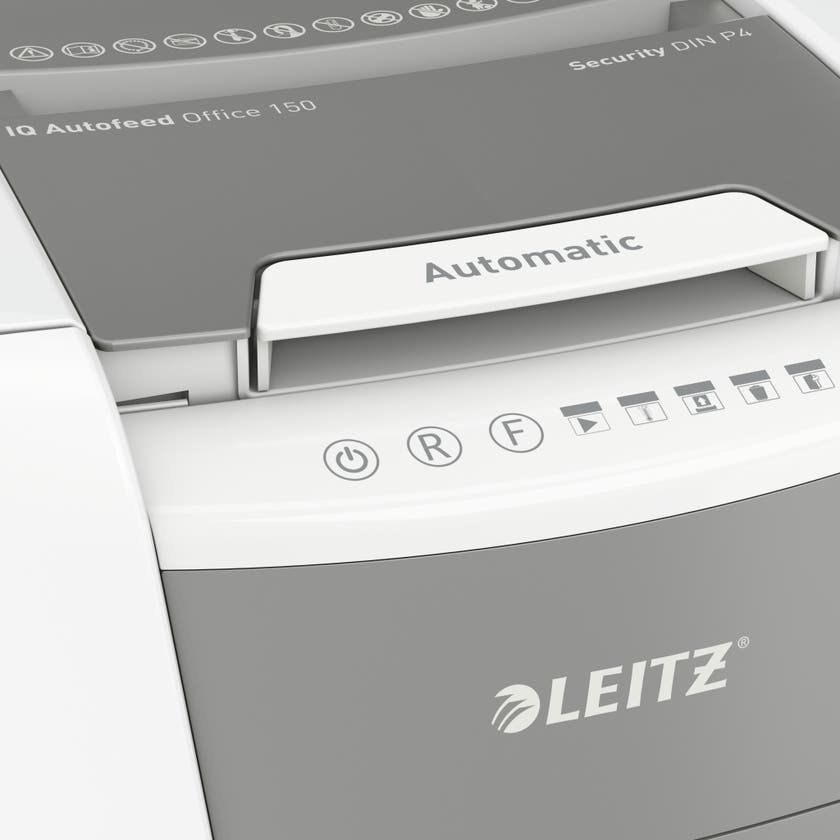 Dokumentförstörare Leitz IQ Auto 150 - P4. Helautomatisk dokumentförstörare från Leitz med unik tömningsfunktion. Så intelligent att den fungerar tyst på egen hand, sätt bara in din pappersbunt (inkl. häftklamrar och gem), stäng locket och fortsätt med annat. Perfekt för användning på kontor.