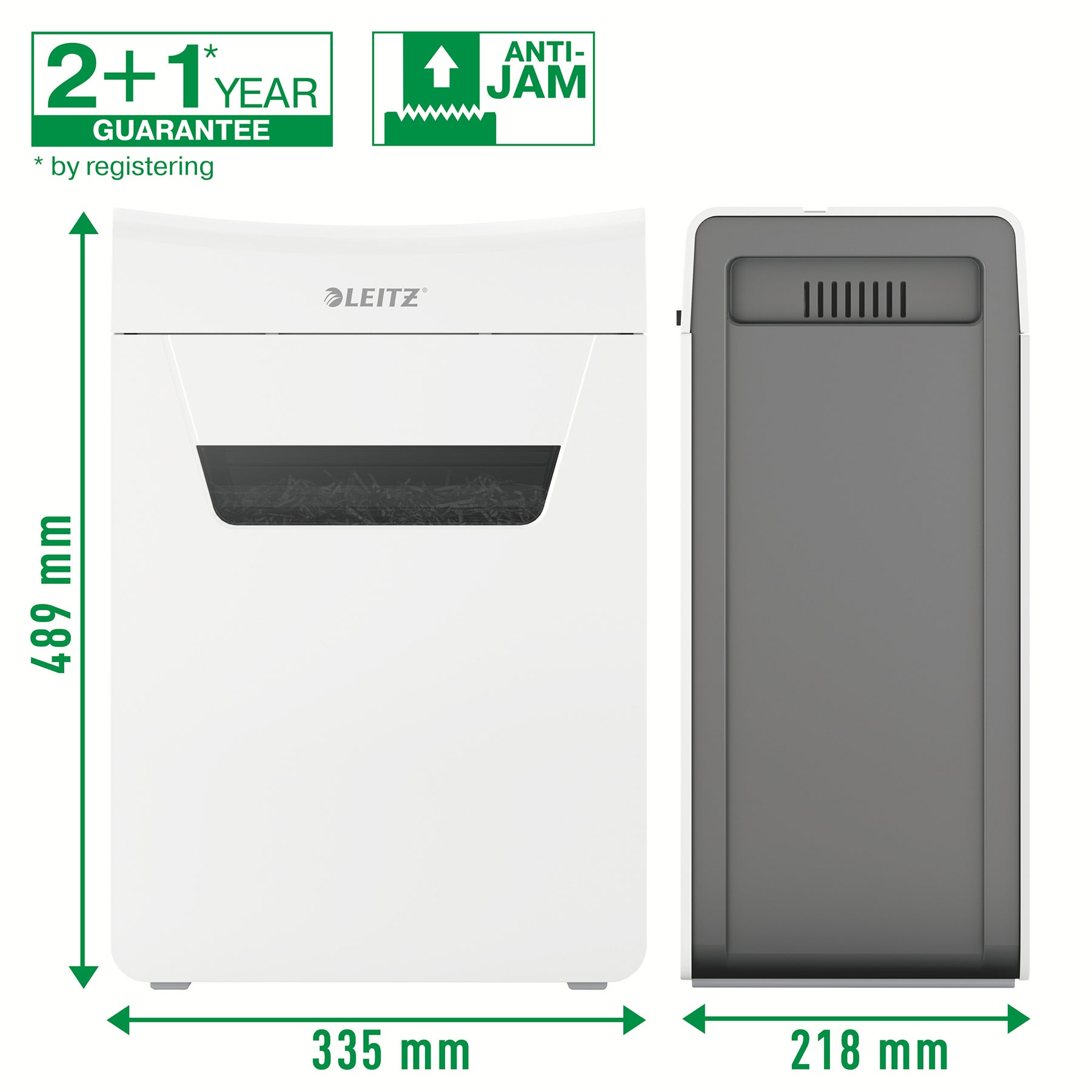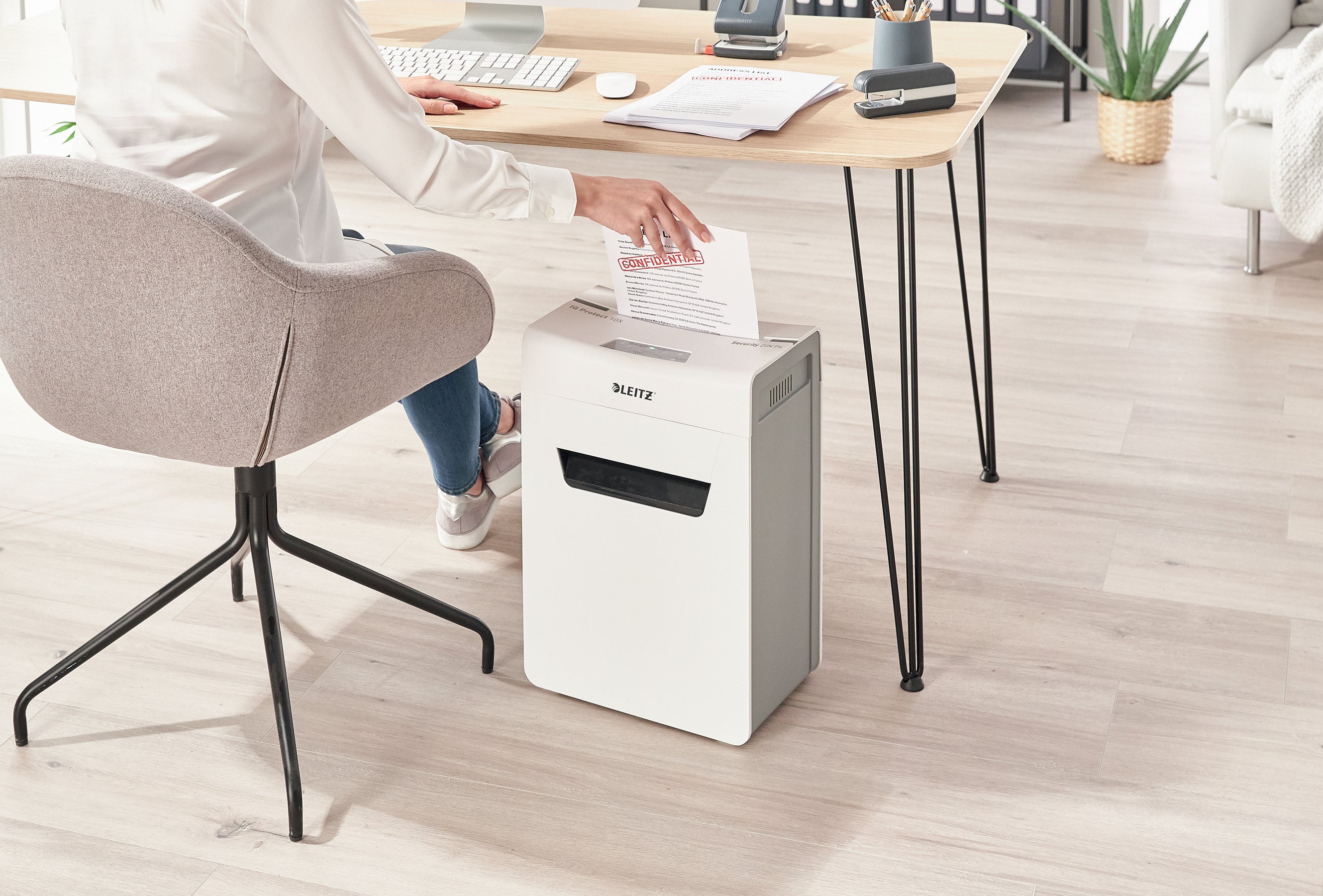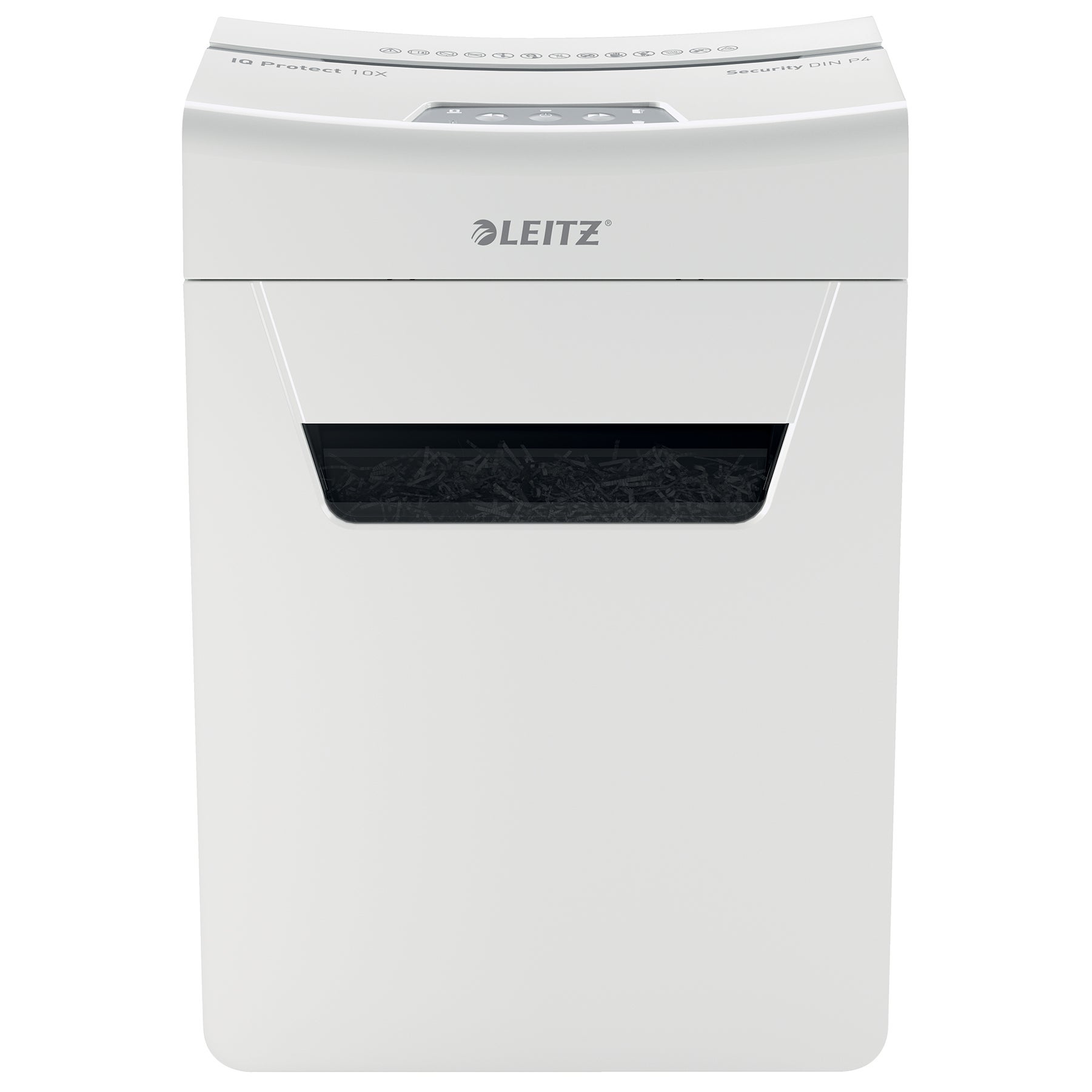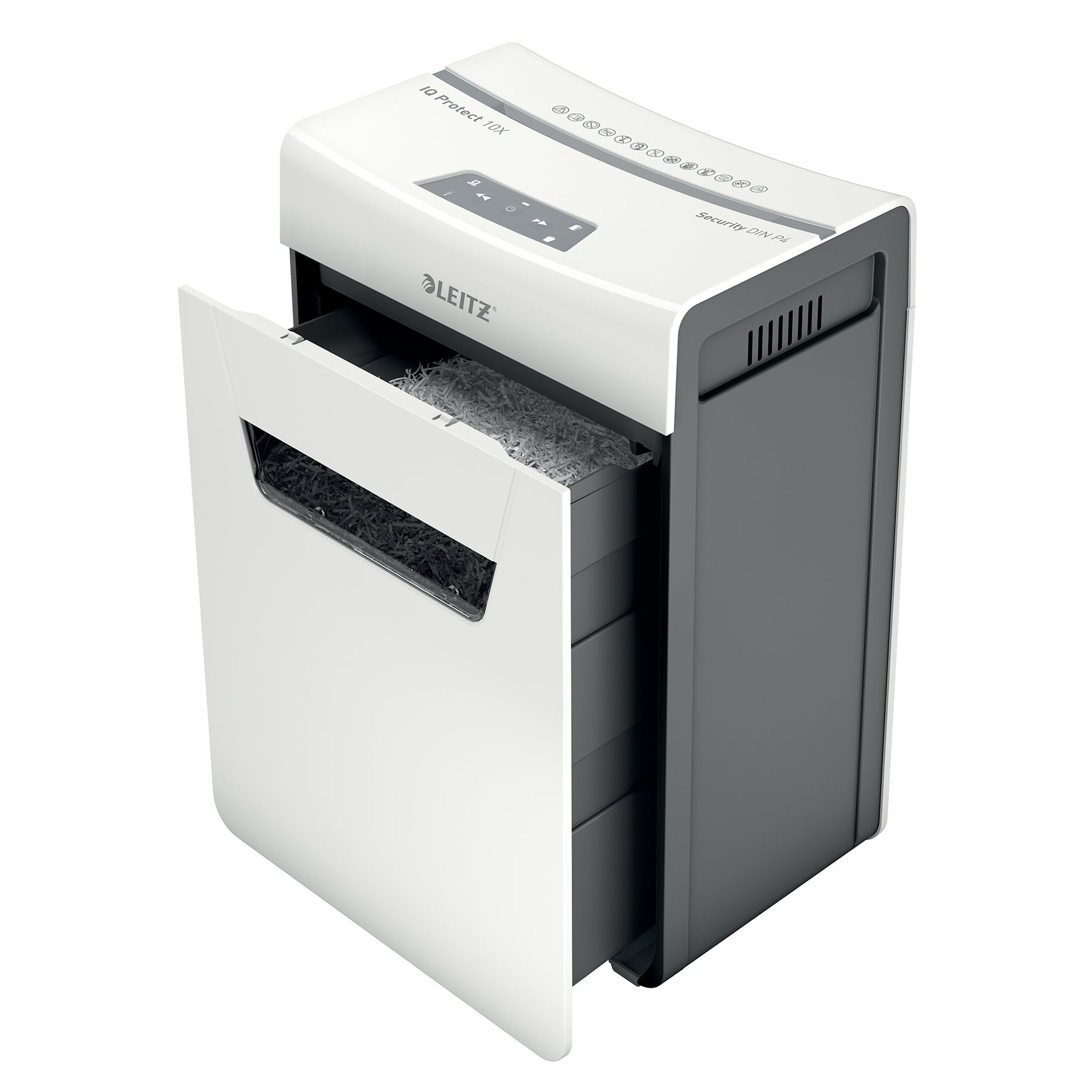 Dokumentförstörare Leitz IQ Protect Premium 10X P4. Denna extremt tysta dokumentförstörare möjliggör en lugn arbetsmiljö och stör inte när du arbetar. Den har renare och snabbare tömning med den praktiska utdragbara avfallsbehållaren på 18 Liter och passar snyggt i alla rum i huset eller under skrivbordet tack vare sin kompakta storlek. De lättanvända pekreglagen gör att du enkelt kan strimla upp till 10 ark A4-papper på en gång. Skydda dina personliga dokument och affärsdata med korsskärning och säkerhetsnivå P4 samtidigt som du får stil till ditt hem eller kontor! Vi rekommenderar att man använder oljeark var tredje gång man tömmer dokumentförstörarens avfallsbehållare.