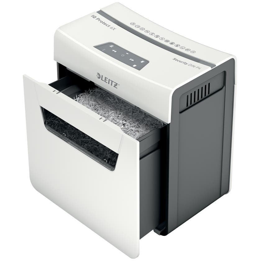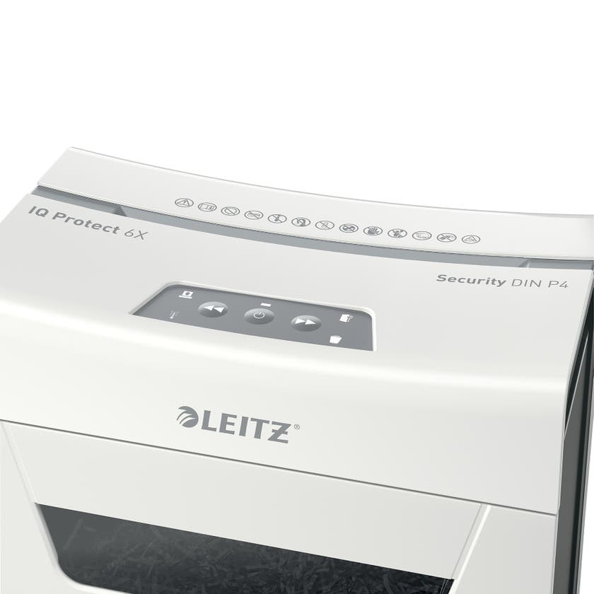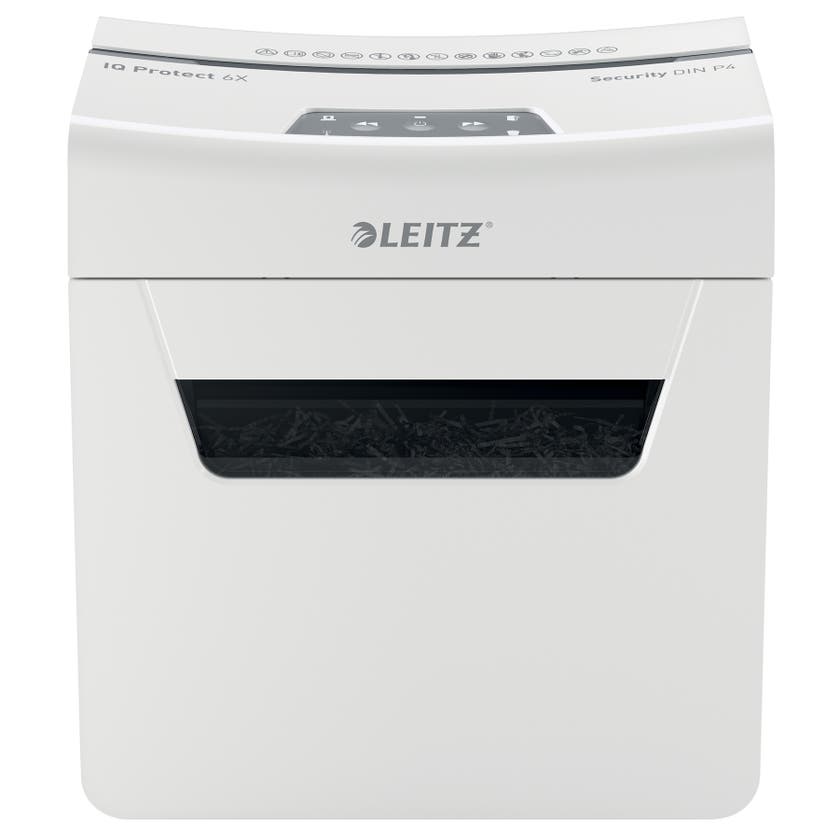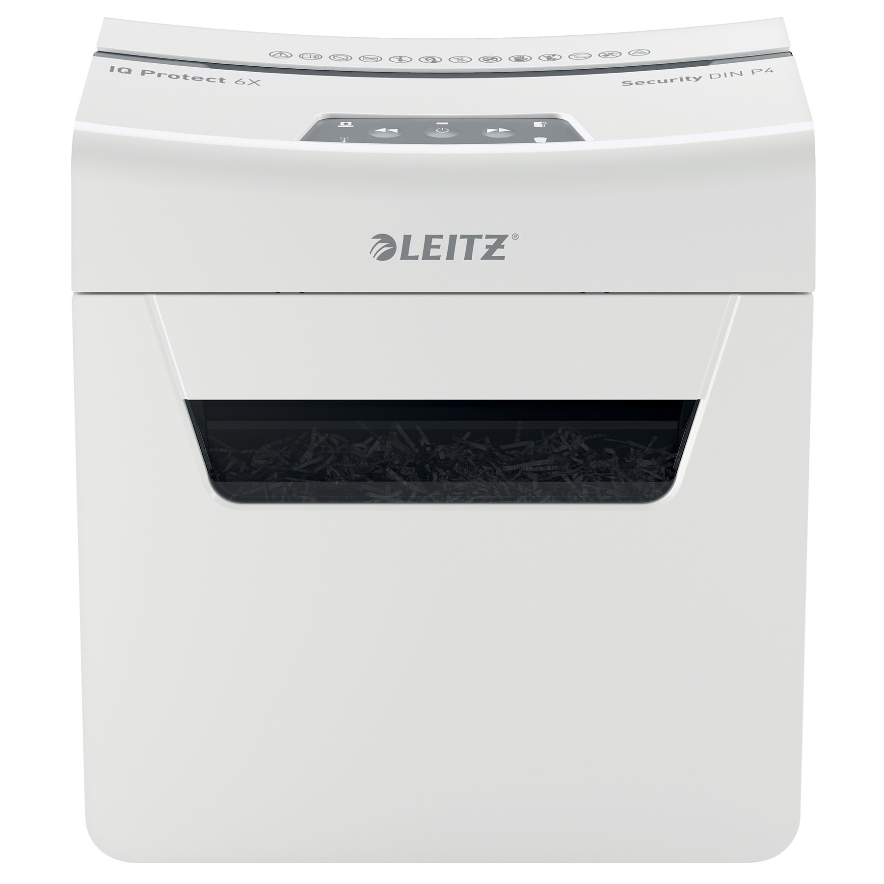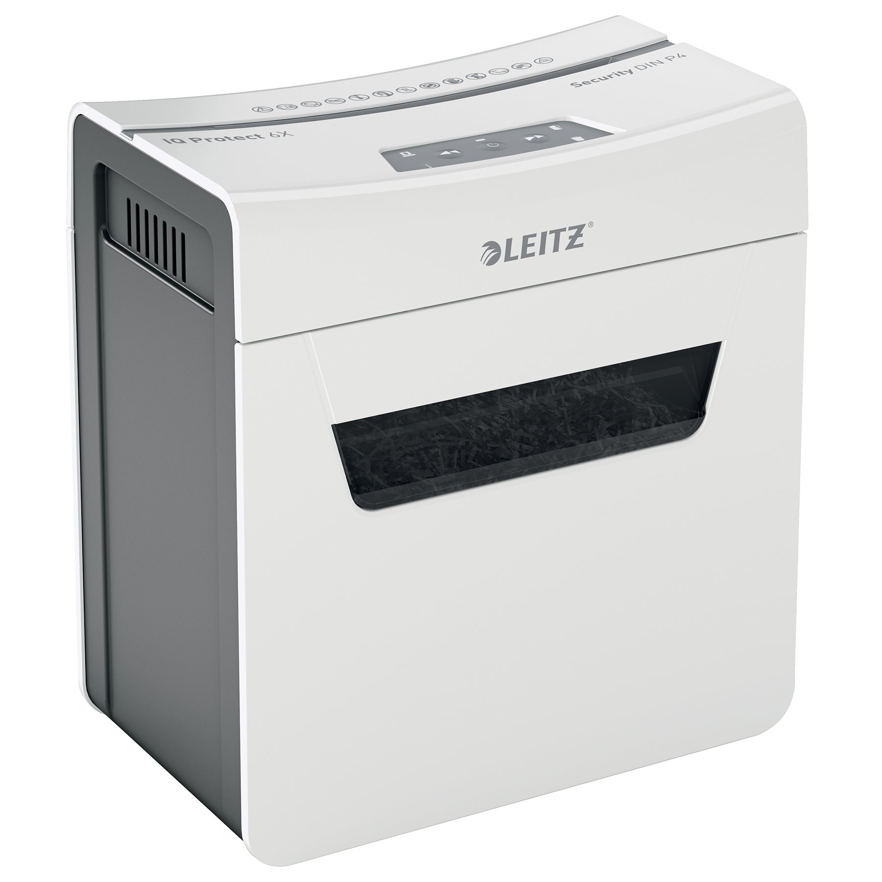 Dokumentförstörare Leitz IQ Protect Premium 6X P4. Denna extremt tysta dokumentförstörare möjliggör en lugn arbetsmiljö och stör inte när du arbetar. Den har renare och snabbare tömning med den praktiska utdragbara avfallsbehållaren på 10 Liter och passar snyggt i alla rum i huset eller under skrivbordet tack vare sin kompakta storlek. De lättanvända pekreglagen gör att du enkelt kan strimla upp till 6 ark A4-papper på en gång. Skydda dina personliga dokument och affärsdata med korsskärning och säkerhetsnivå P4 samtidigt som du får stil till ditt hem eller kontor!