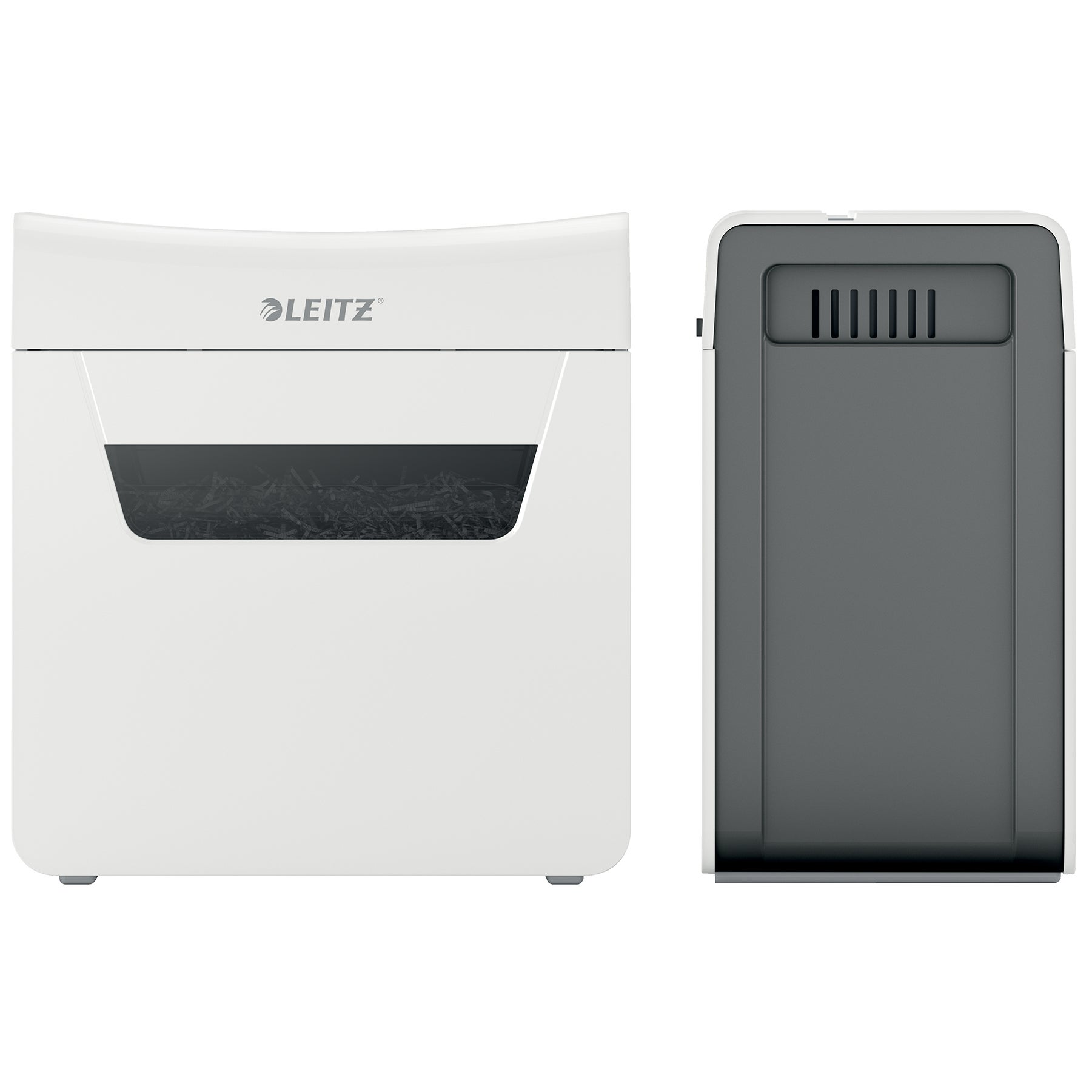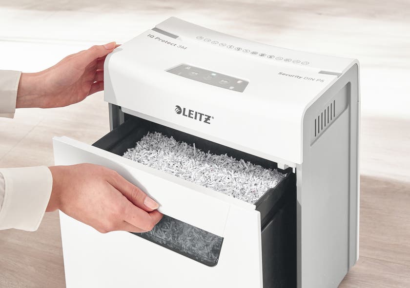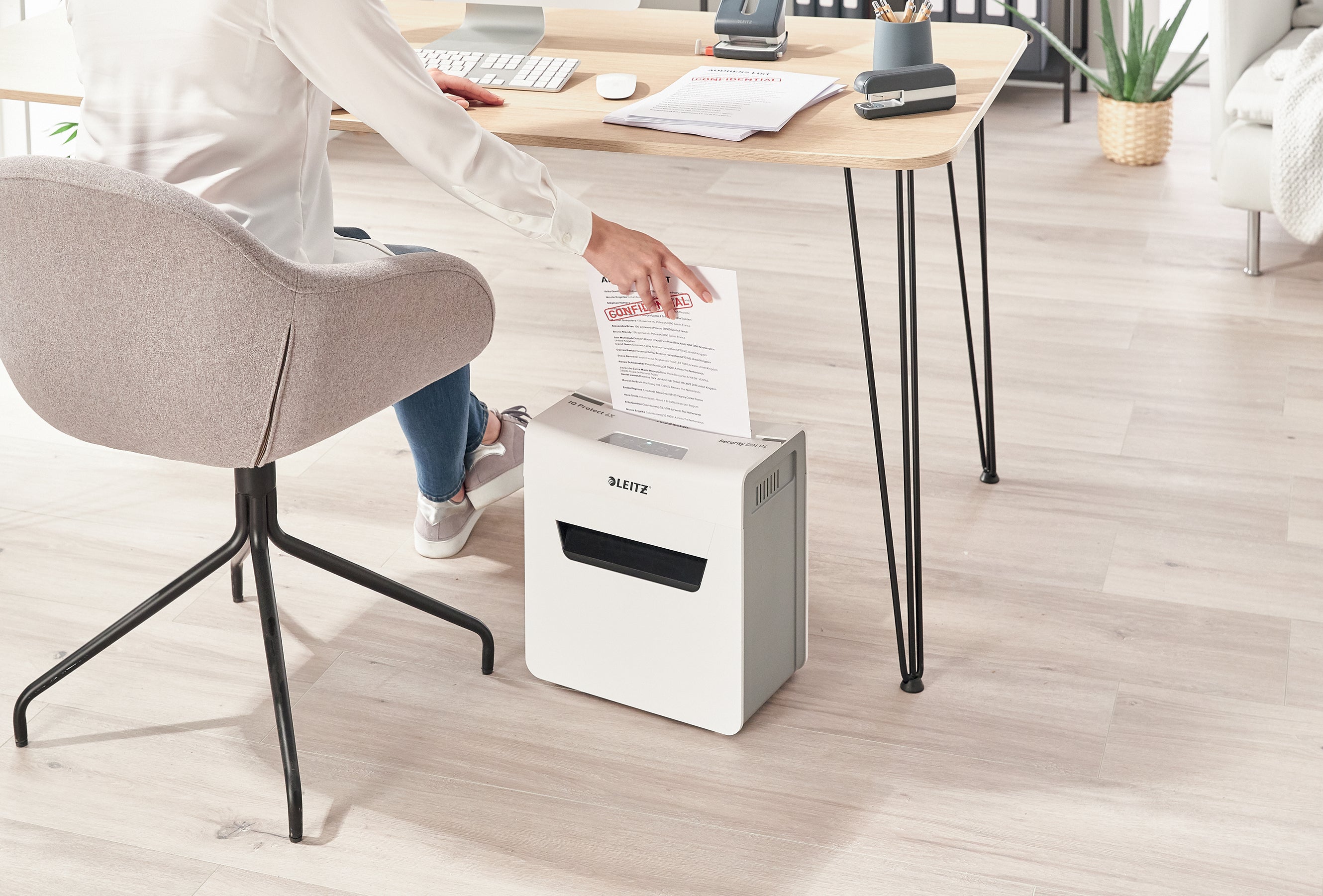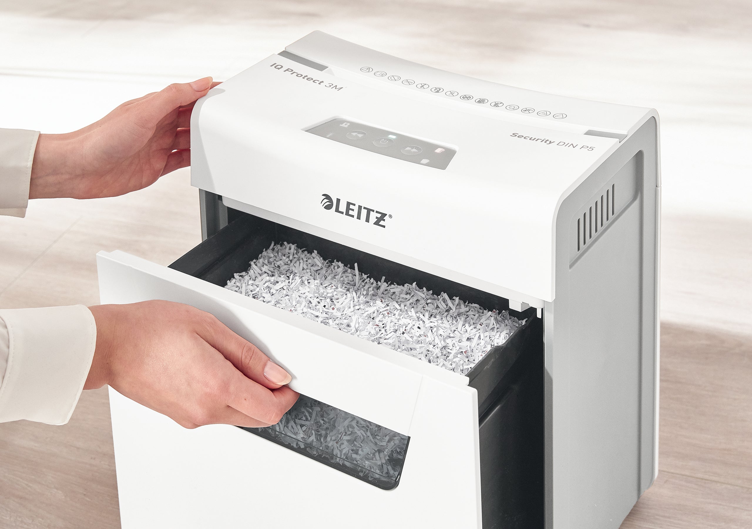 Dokumentförstörare Leitz IQ Protect Premium 6X P4. Denna extremt tysta dokumentförstörare möjliggör en lugn arbetsmiljö och stör inte när du arbetar. Den har renare och snabbare tömning med den praktiska utdragbara avfallsbehållaren på 10 Liter och passar snyggt i alla rum i huset eller under skrivbordet tack vare sin kompakta storlek. De lättanvända pekreglagen gör att du enkelt kan strimla upp till 6 ark A4-papper på en gång. Skydda dina personliga dokument och affärsdata med korsskärning och säkerhetsnivå P4 samtidigt som du får stil till ditt hem eller kontor!