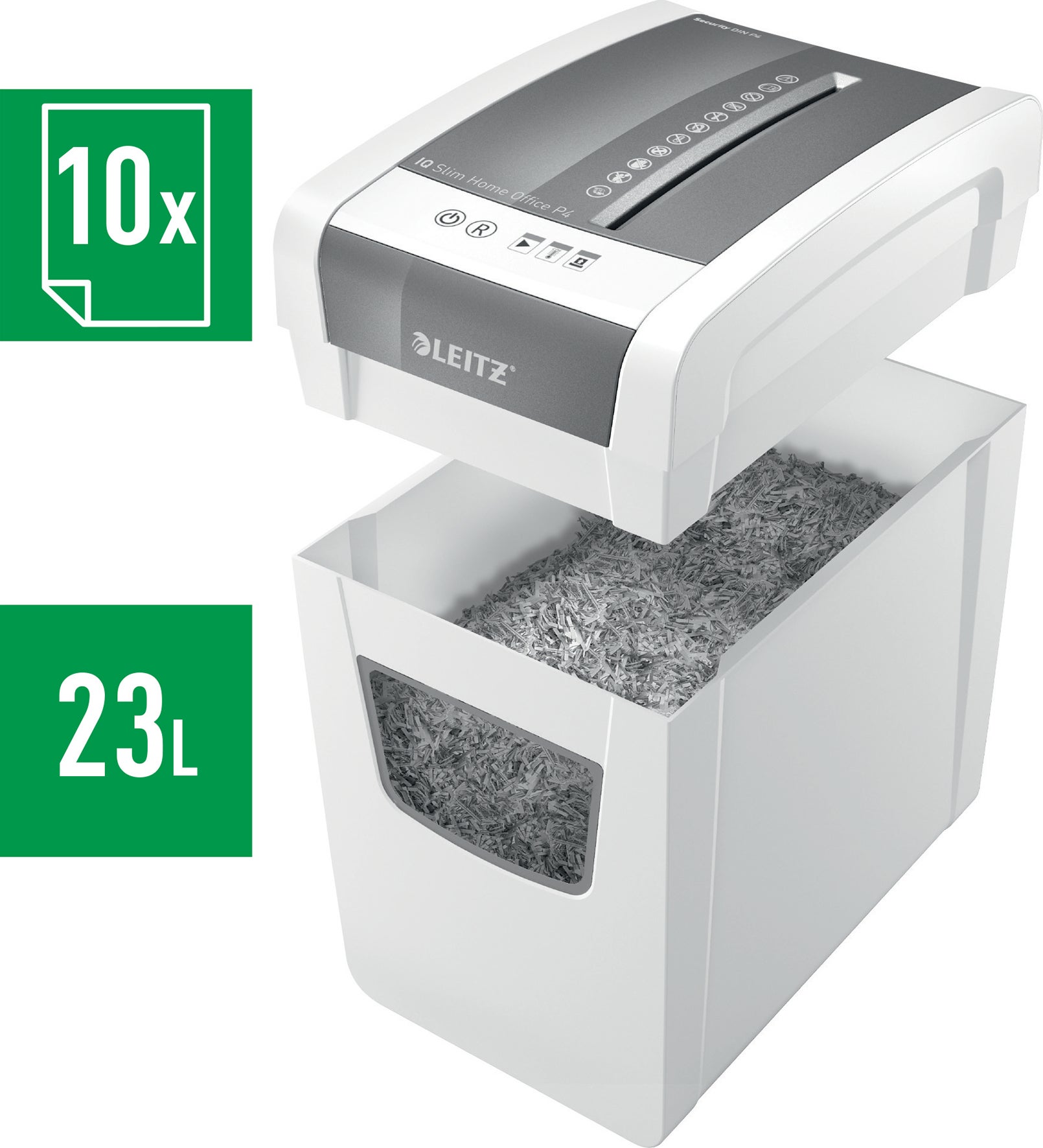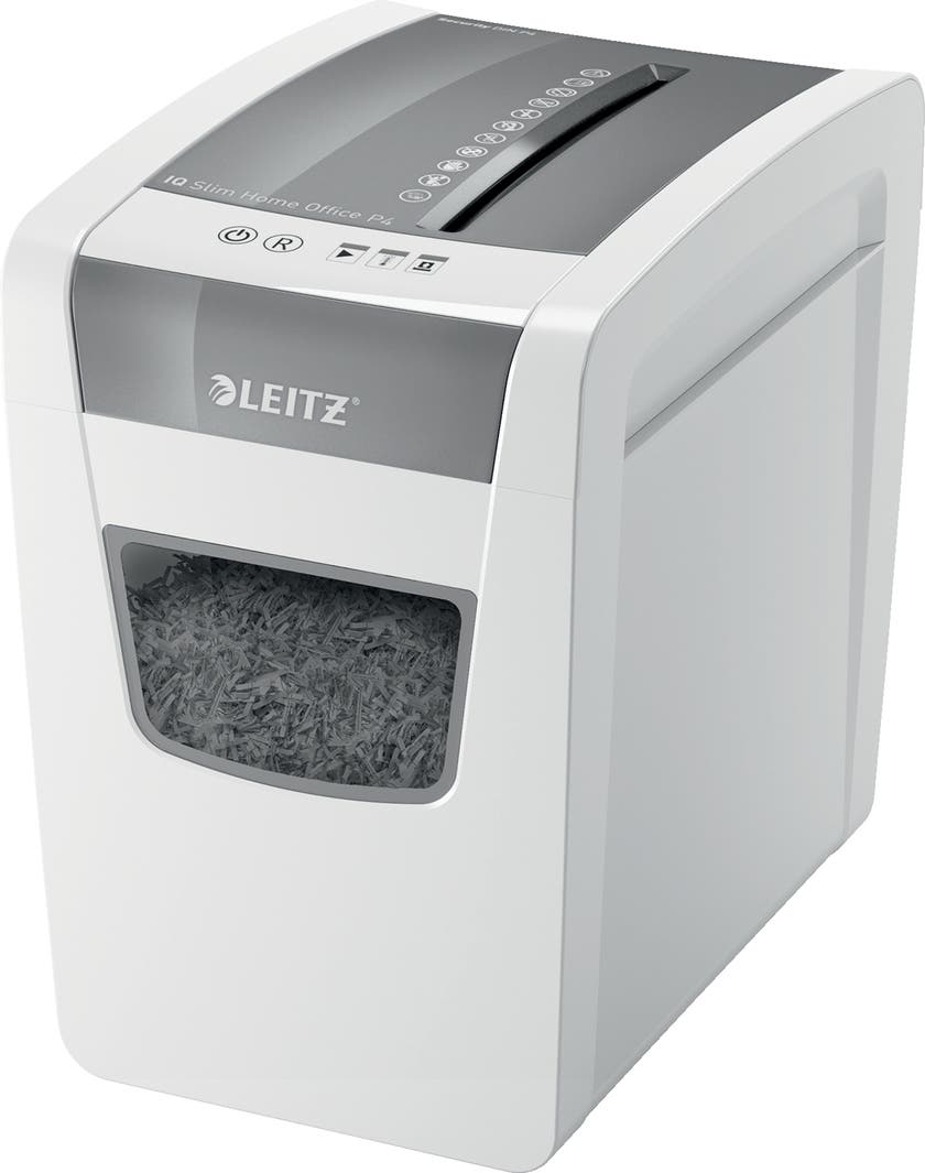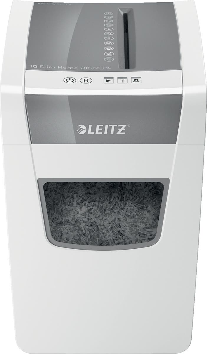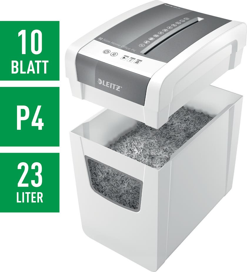 IQ Slim Home Office P4 dokumentförstörare från Leitz i elegant tunn design. En dokumentförstörare är bra att ha på kontoret eller på hemmakontoret när du är i behov av att makulera olika typer av dokument. Med sin kompakta och smala storlek är den enkel att ha i många olika rum och idealisk för hemmakontorsanvändare. Sätt stil på ditt hemmakontor med denna trasselfria, tysta dokumentförstörare med lång drifttid. Strimla 10 ark A4 i den generösa 23 liters facket med enkel användning med touch-kontroller. Öka säkerheten i din dokumentförstörelse med denna säkerhetsklassade DIN P4-dokumentförstörare som är försedd med en barnsäker låsfunktion. Vi rekommenderar att man använder oljeark var tredje gång man tömmer dokumentförstörarens avfallsbehållare.