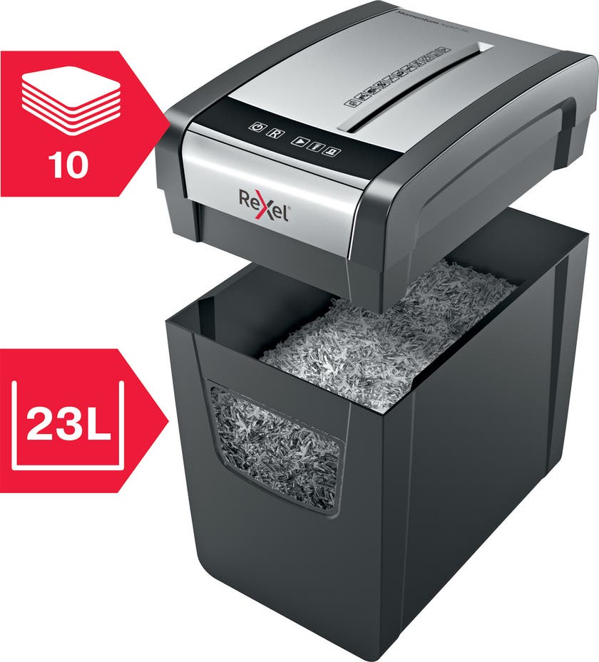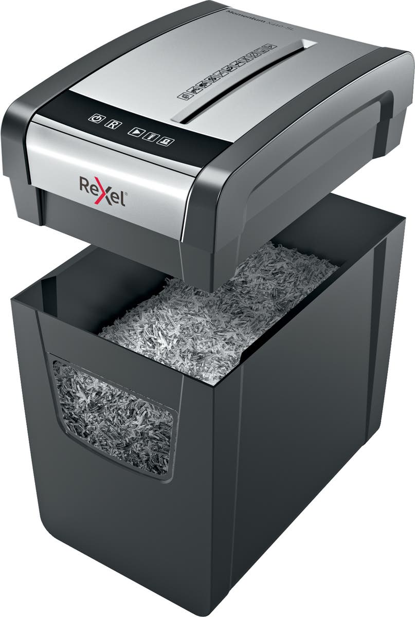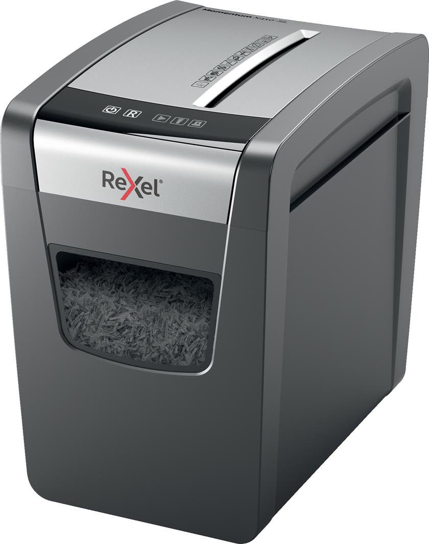 Med kraft att makulera mer! Rexel Momentum X410-SL dokumentförstörare makulerar upp till 10 ark i en inmatning med en kontinuerlig driftstid på 6 minuter och en smalare design, vilket gör den idealisk för användning i hemmet.