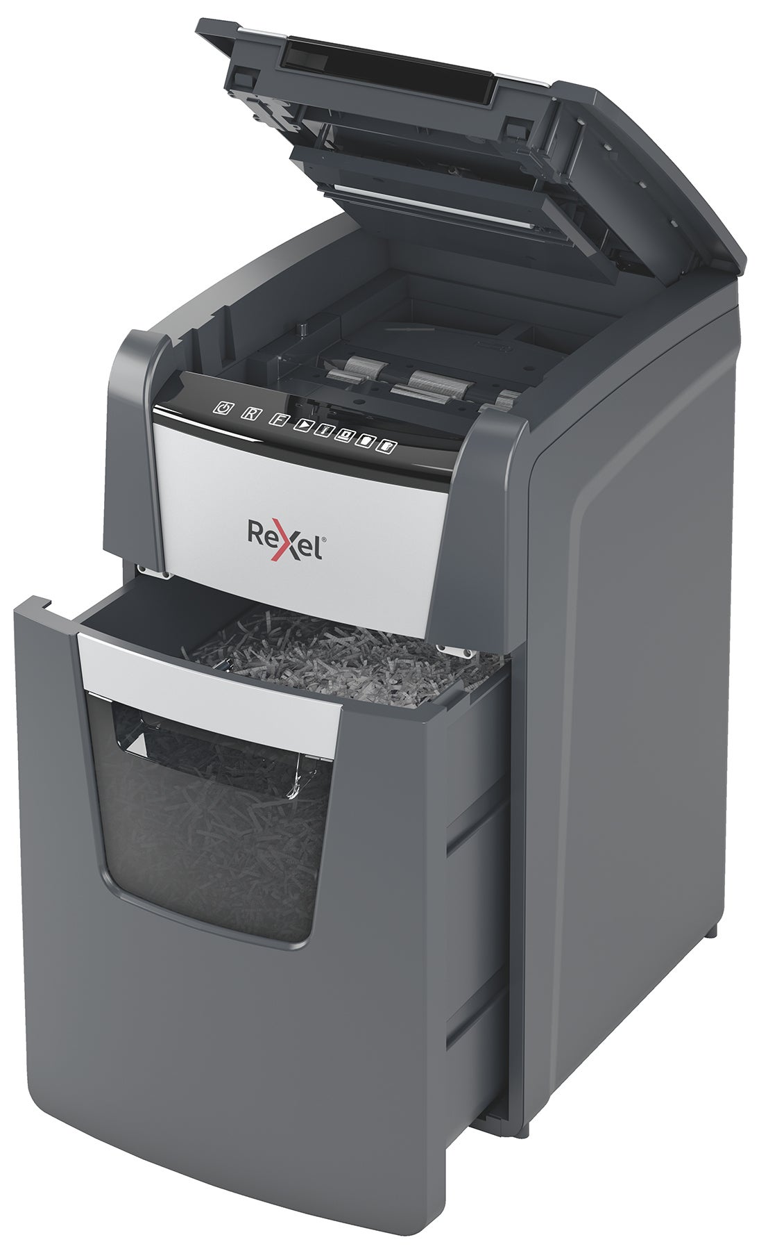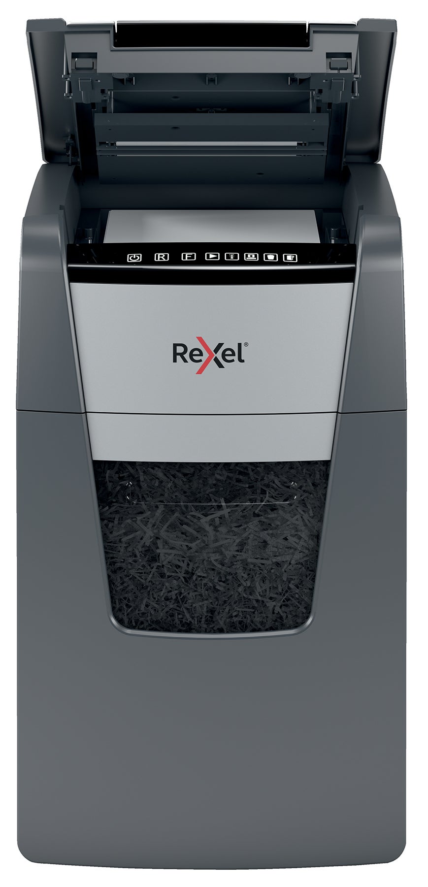 Dokumentförstörare Rexel Optimum AutoFeed+ 150M P5. Optimum AutoFeed+ 150M makulerar automatiskt upp till 150 A4 pappersark (80 g/m2) åt gången, i P-5 (2x15 mm) mikro tvärsnitt. Den här dokumentförstöraren med automatisk inmatning är idealisk för användning på kontoret på grund av dess kompakta 44 Liter-avfallsbehållare. Du behöver inte mata papper manuellt eller ta bort häftklamrar och gem först. Den här automatiska dokumentförstöraren gör allt arbete åt dig. Vi rekommenderar att man använder oljeark var tredje gång man tömmer dokumentförstörarens avfallsbehållare.