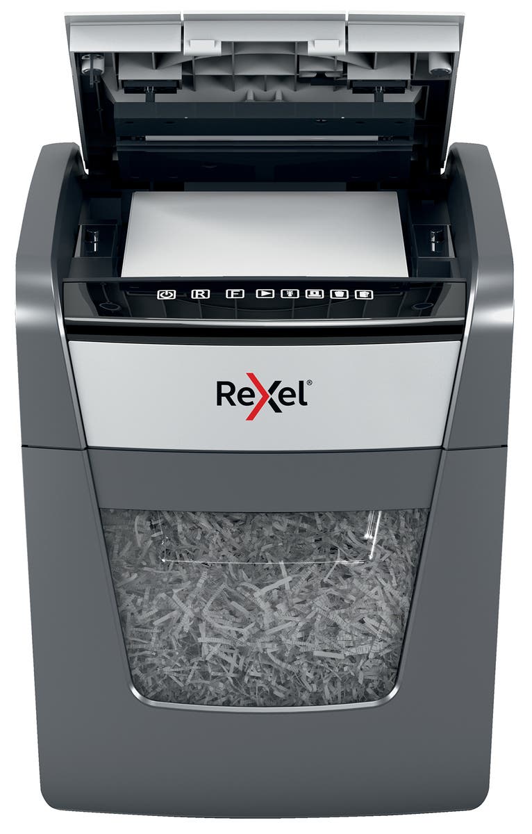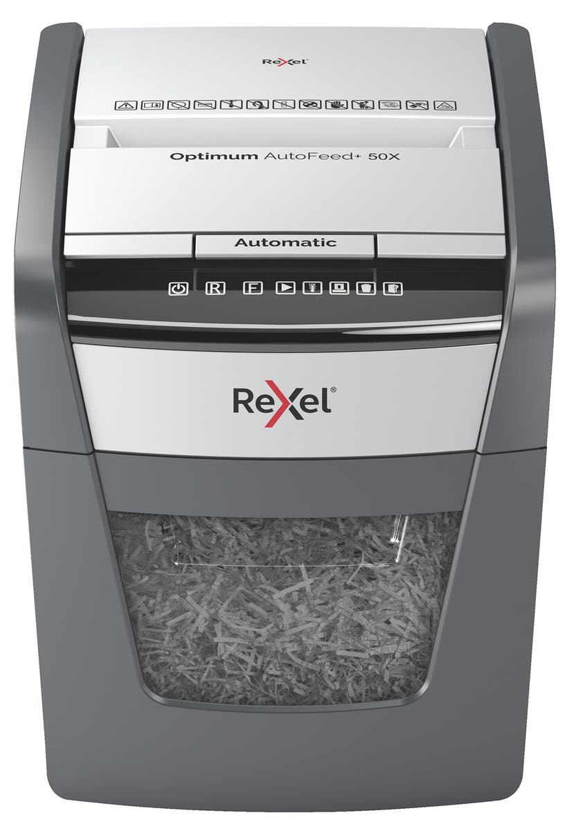 Dokumentförstörare Rexel Optimum AutoFeed+ 50X P4. Optimum AutoFeed+ 50X makulerar automatiskt upp till 50 A4 pappersark (80 g/m2) åt gången, i P-4 (4x28 mm) tvärsnitt. Den här dokumentförstöraren med automatisk inmatning är idealisk för användning i hemmet eller på hemmakontoret på grund av dess kompakta 20 liters avfallsbehållare. Du behöver inte mata papper manuellt eller ta bort häftklamrar och gem först. Den här automatiska dokumentförstöraren gör allt arbete åt dig. Vi rekommenderar att man använder oljeark var tredje gång man tömmer dokumentförstörarens avfallsbehållare.