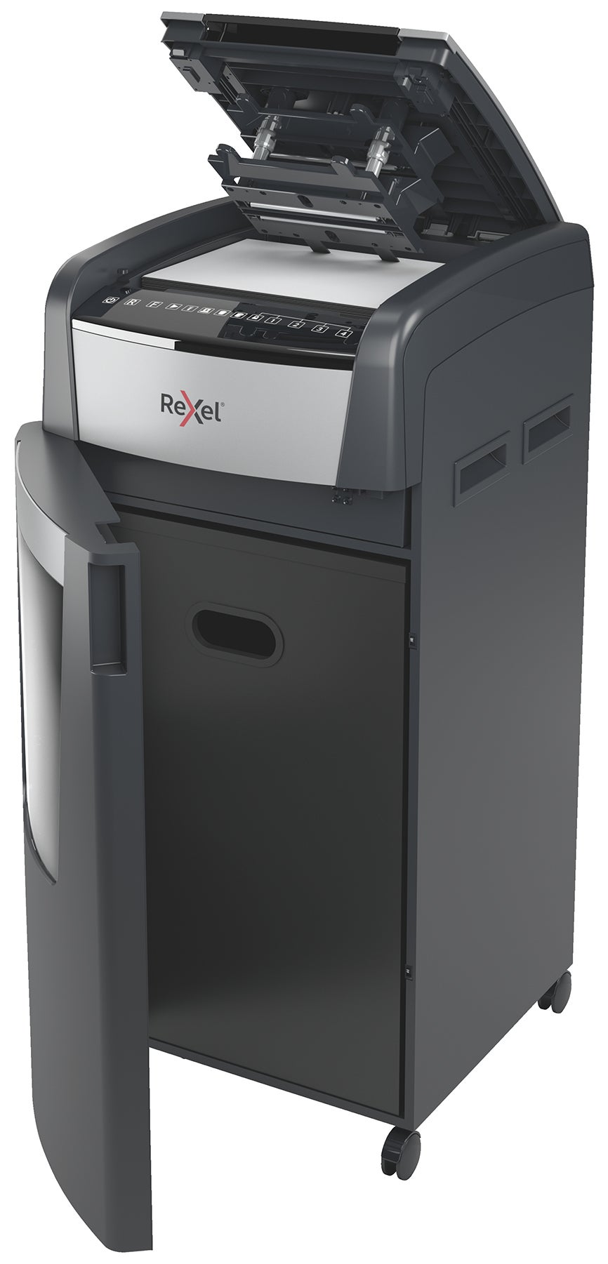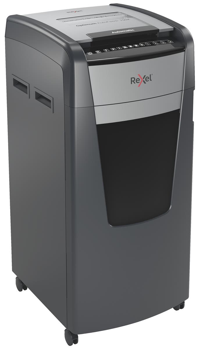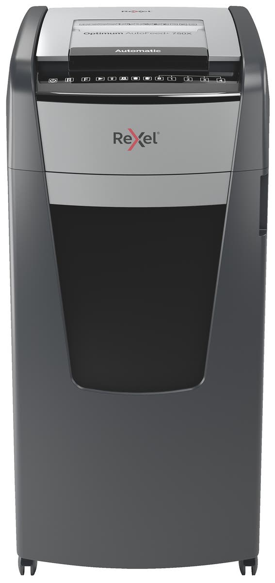 Dokumentförstörare Rexel Optimum AutoFeed+ 750X P4. Optimum AutoFeed+ 750X makulerar automatiskt upp till 750 A4 pappersark (80 g/m2) åt gången, i P-4 (4x30 mm) tvärsnitt. Den här dokumentförstöraren med automatisk inmatning är idealisk för användning på kontoret på grund av dess kompakta utdragbara 44 liters avfallsbehållare.