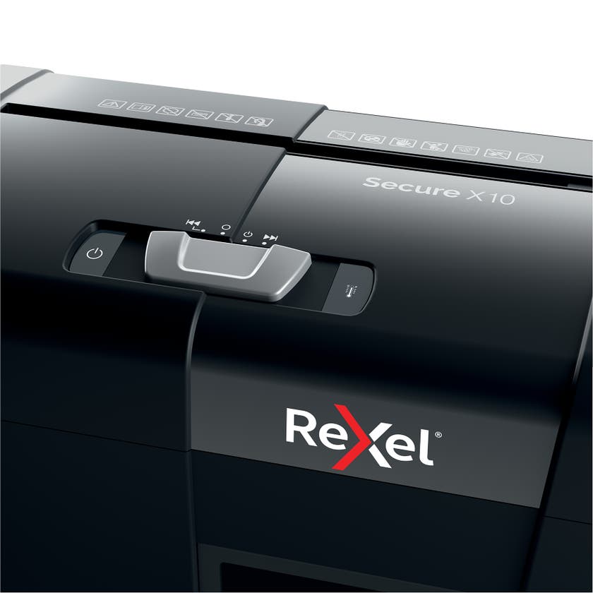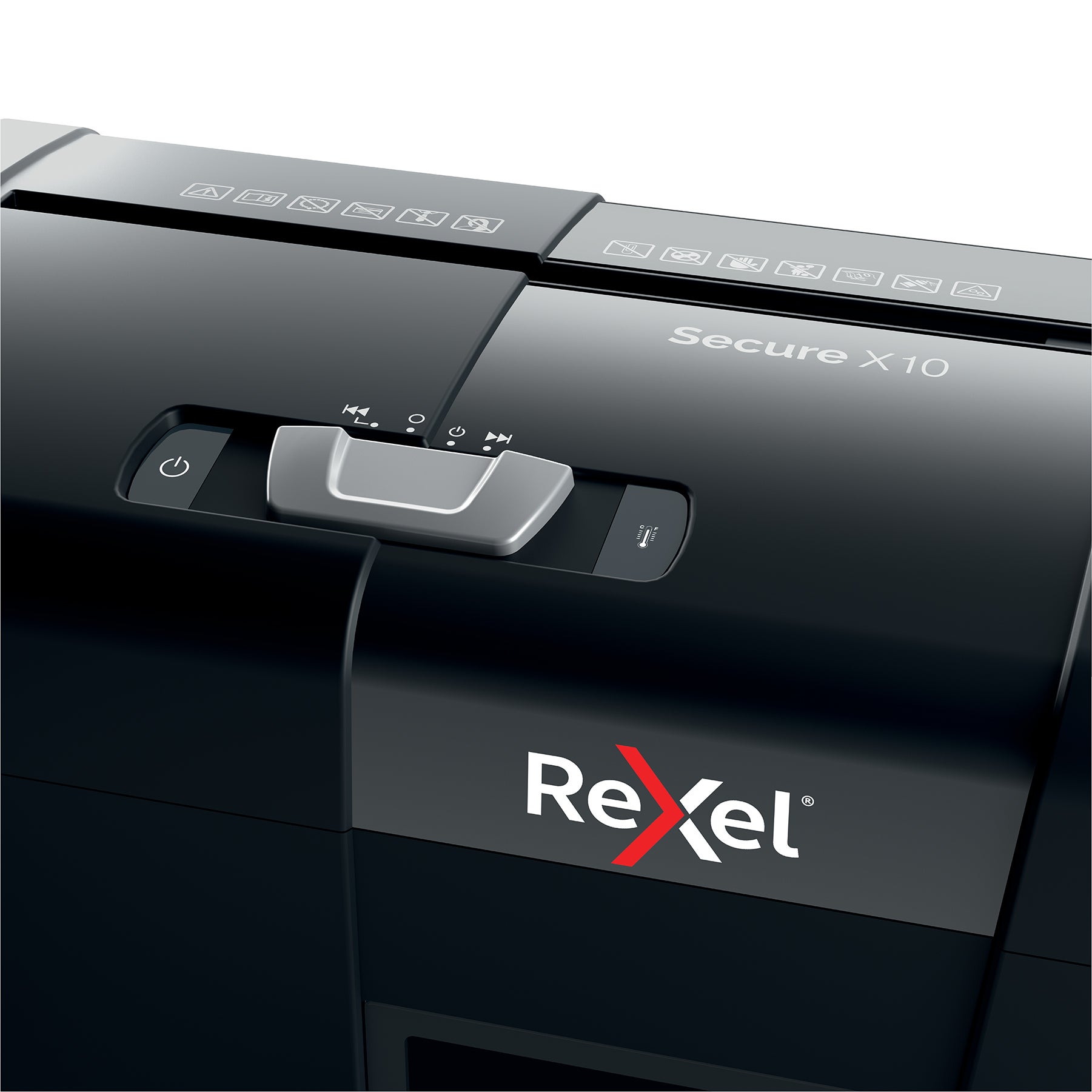 Dokumentförstörare Rexel Secure X10 P4. Secure X10 dokumentförstörare strimlar upp till 10 ark A4-papper (80 g/m²) på en gång genom det manuella inmatningsfacket i P-4 (4x40 mm) korsskurna bitar.