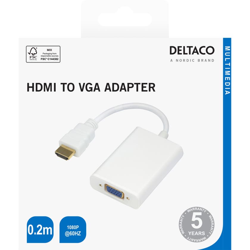 Deltacos adapter HDMI till VGA. Konverterar signalen från en HDMI-källa till en VGA-skärm. 3,5 mm utgång för ljud och ingång för strömmatning med USB Typ Micro B om det skulle behövas. Släng inte bort din gamla VGA-skärm i onödan med hjälp av denna adapter.