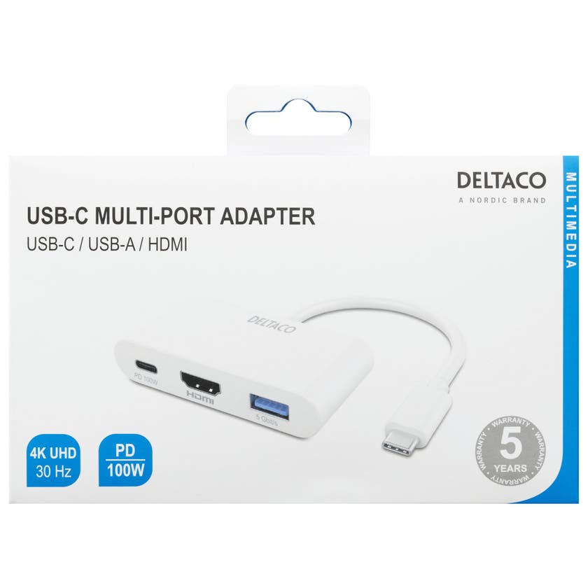 Anslut snabbt och enkelt en extra skärm eller projektor med HDMI-anslutning till din enhet med USB-C. Adaptern har också en USB-A-port för att kunna ansluta annan kringutrustning. Den har även en USB-C-port för att samtidigt kunna ladda enheten som adaptern är kopplad till.