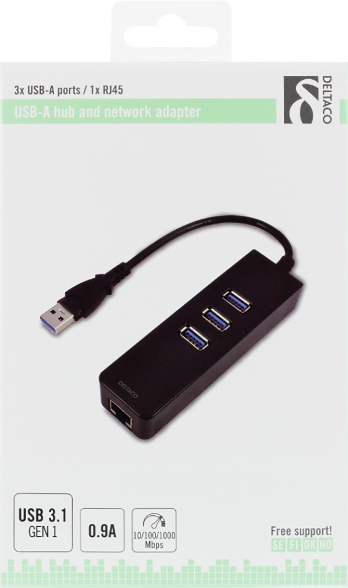 USB 3.0 nätverksadapter 10/100/1000Mbps från Deltaco. Gör det möjligt att ansluta en nätverkskabel till din Ultrabook, Macbook Air eller annan enhet som saknar nätverkskort med uttag för RJ45. Med SuperSpeed USB och Gigabit-nätverk får du maximal hastighet på ditt nätverk. Denna enhet har även tre stycken USB3.0 Typ A Hon-portar vilket gör att den dessutom kan fungera om en USB-hubb.