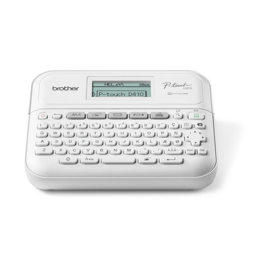 Märkmaskin Brother PT-D410. En kompakt, lättanvänd märkmaskin som skriver ut skarpa, laminerade etiketter som hjälper dig att anpassa dina viktiga filer och mappar, identifiera utrustning och kablar för hemmakontoret och organisera dina förvaringslådor.<br<