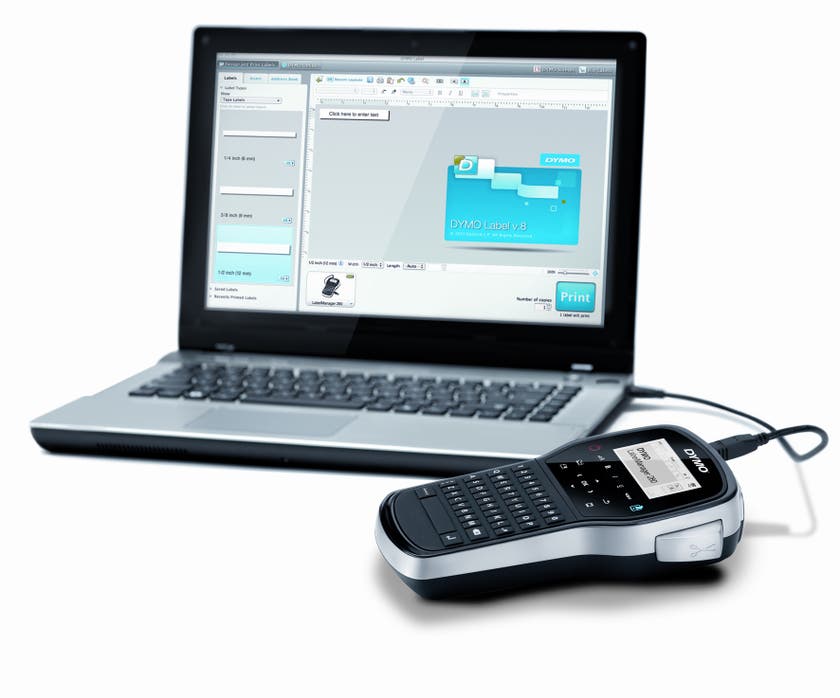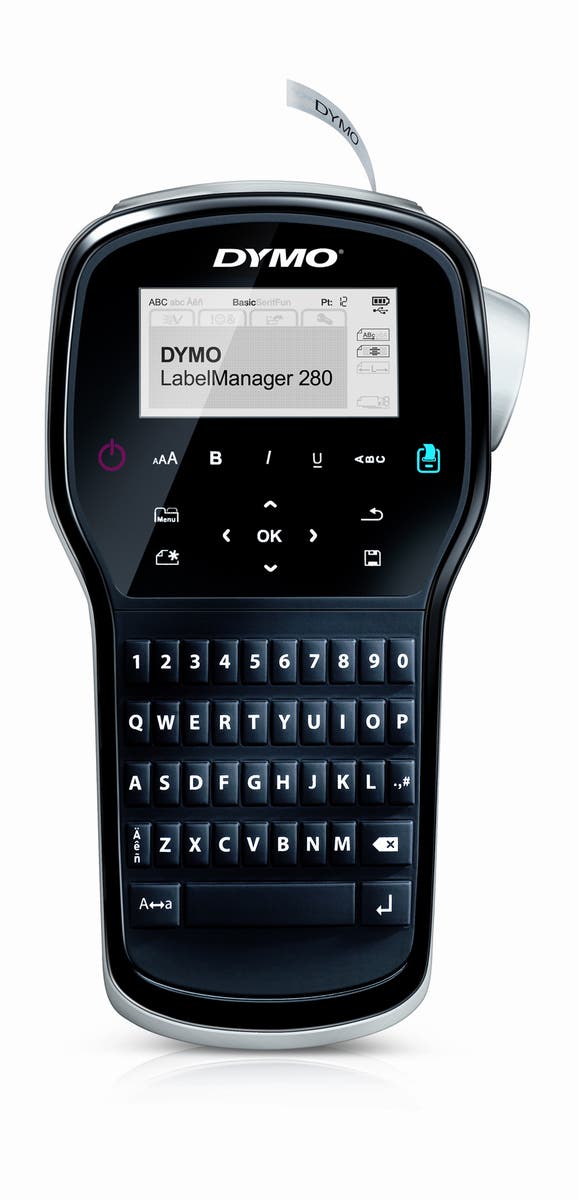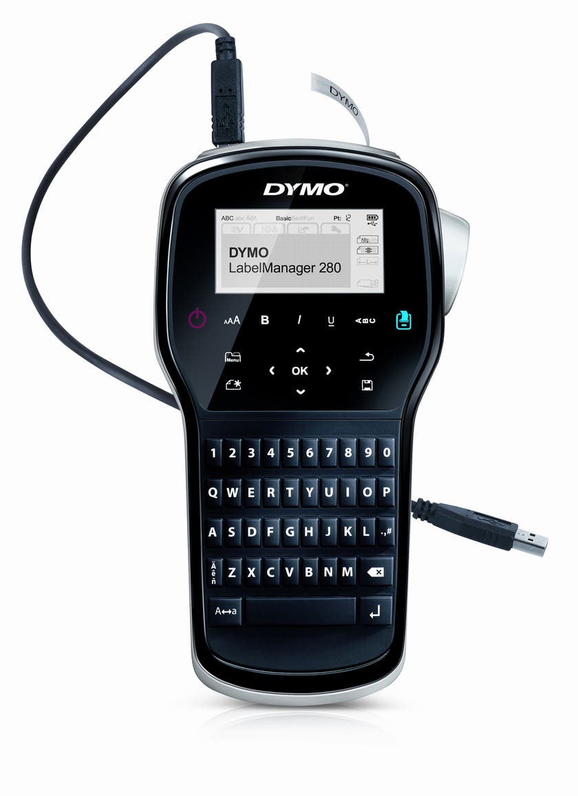 Dymo LM 280 den portabel märkmaskin med QWERTY-tangentbord, som är en lättanvänd handhållen märkmaskin för både kontor och hemmabruk. Producera dina etiketter när du är på språng och skriv ut dem omgående. Skapa dina etiketter med valfria teckensnitt och bilder från datorn via Windows- eller Macanslutning.