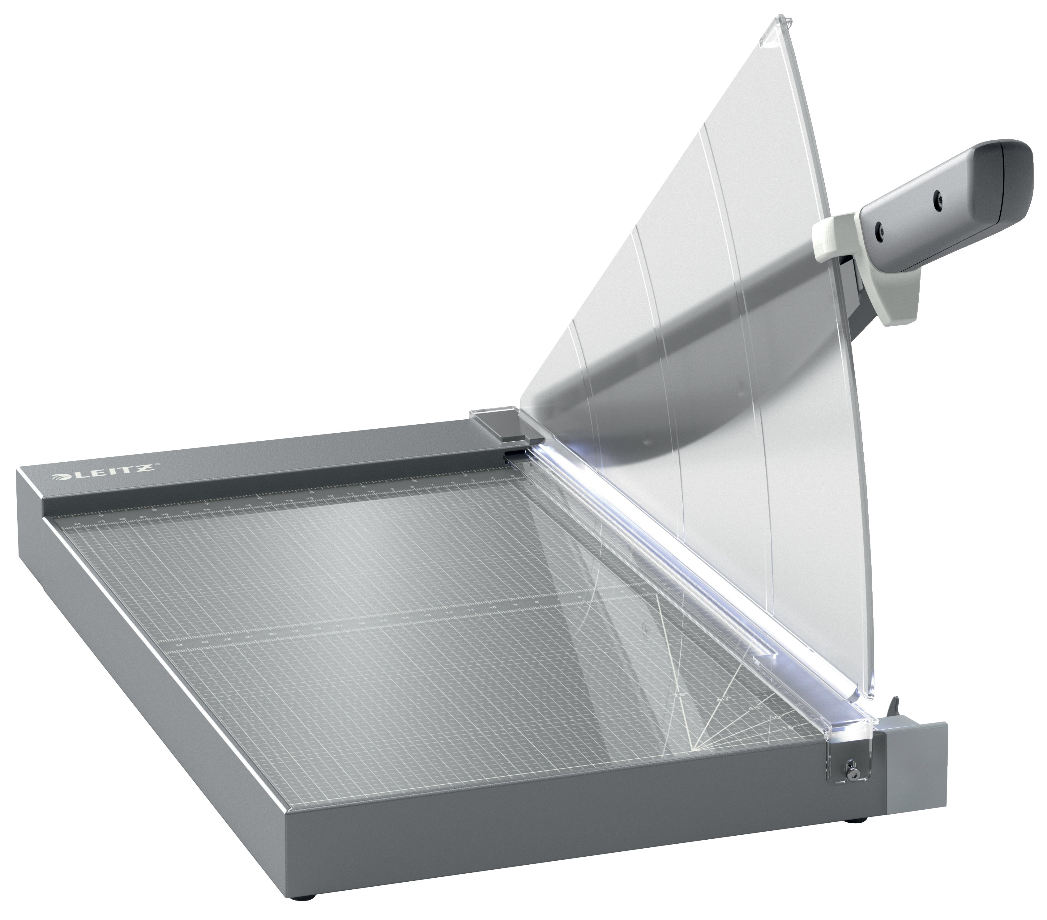 Har unik EdgeGlow-ljusteknik som belyser skärkanten för bättre synlighet och maximal precision. Den tydliga, manuella pappersklämman håller pappret säkert, medan det ergonomiska handtaget gör det bekvämt och enkelt att skära. Det går snabbt och enkelt att rikta in pappret med hjälp av de enkla riktlinjerna på den släta arbetsytan av glas. Det säkra säkerhetsskyddet för bladet ger totalt skydd och säkerhetslåset håller bladet låst när det inte används.
