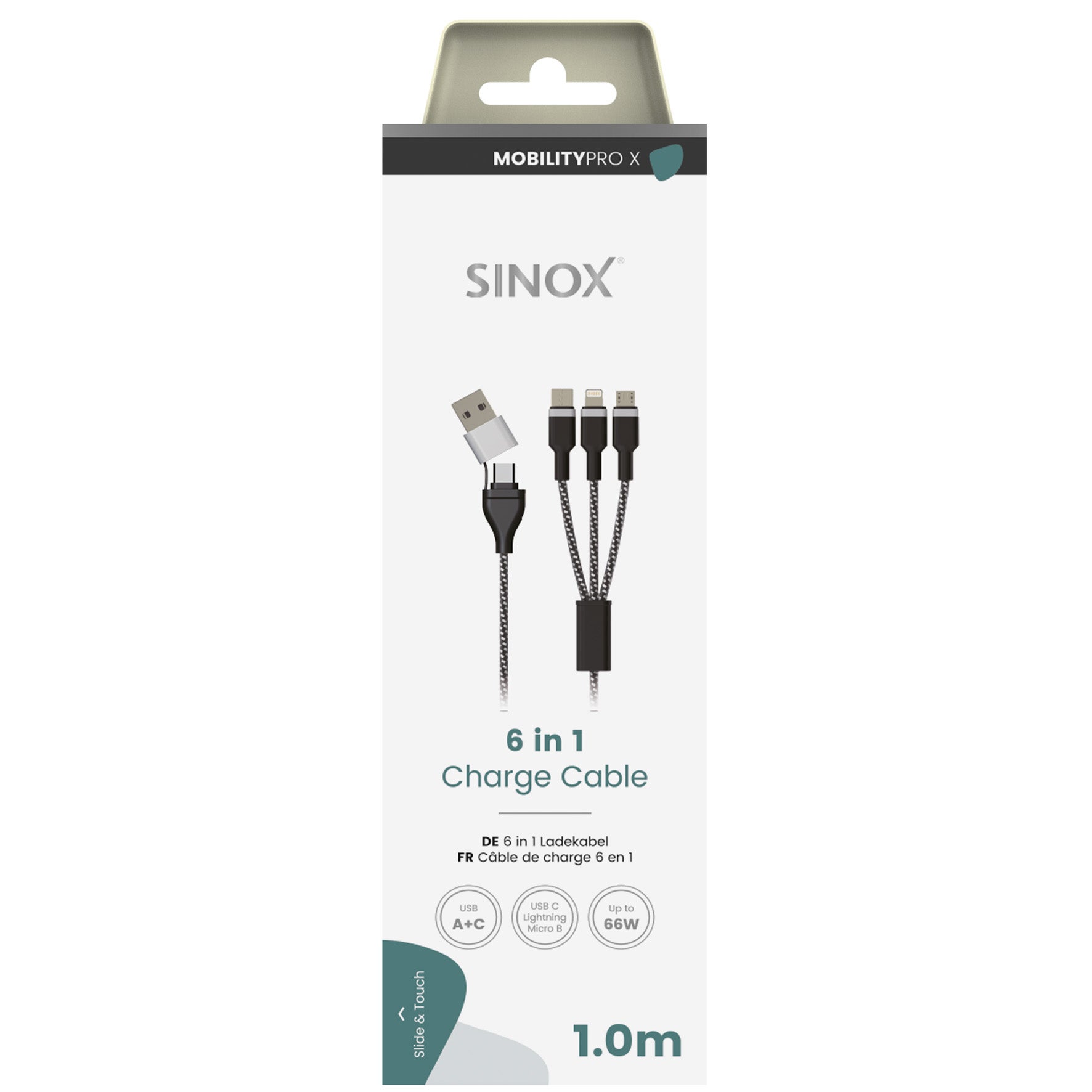 Sinox PRO X 6-i-1-kabel med Lightning, USB-C och Micro USB. Den flätade kabeln kan användas för att ladda de flesta enheter som använder USB C, Micro USB och Lightning. Passar till iPhone®, iPad®, Apple TV® fjärrkontroll, samt fungerar för alla Android®-telefoner.