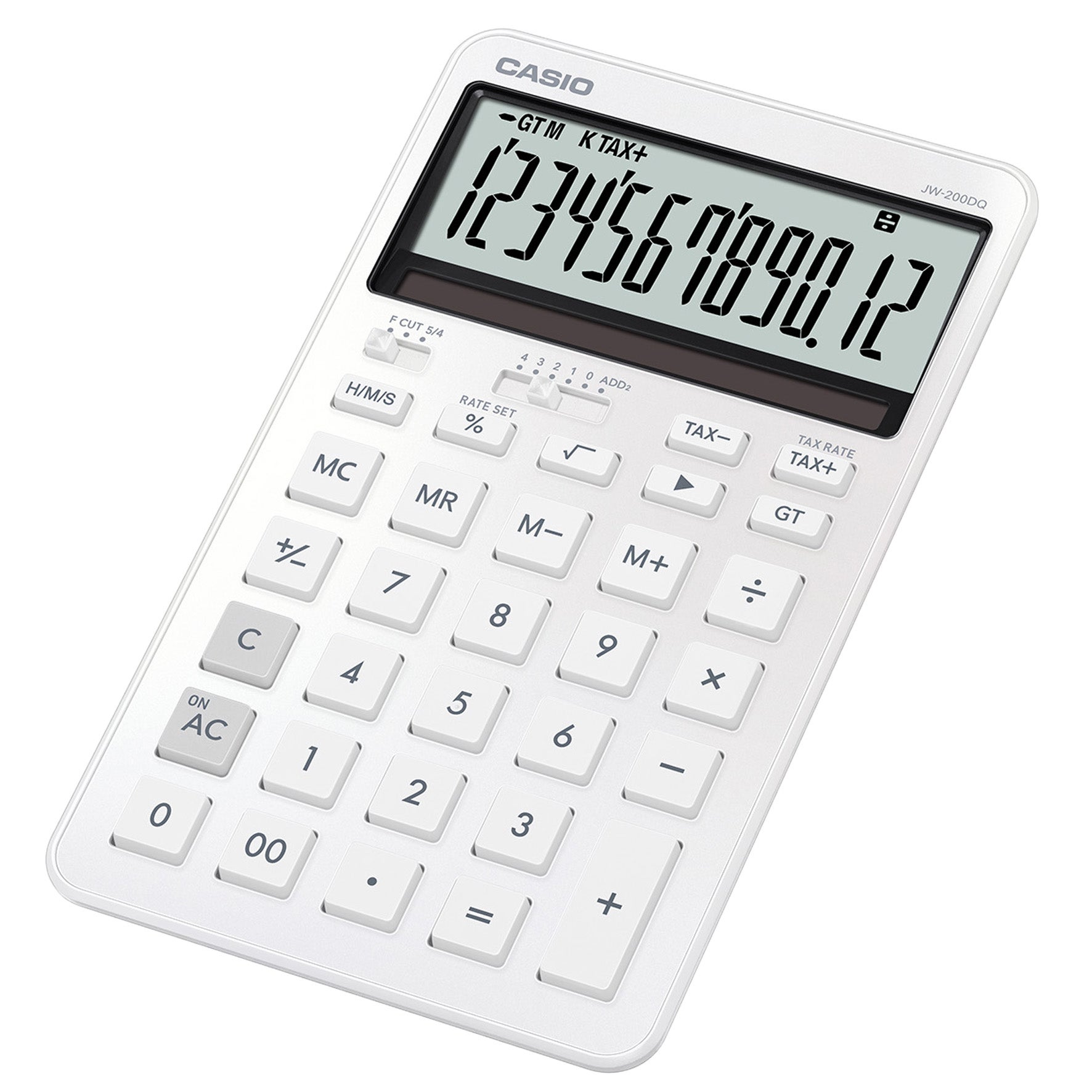 Den stora 12-siffriga displayen (9,3×3,2 cm) visar tydligt beräkningsläge och har en tydlig skala i tusental. Professionell procentberäkning enligt CASIOs unika inmatningslogik visar procentens absolutvärde innan det läggs till basvärdet.